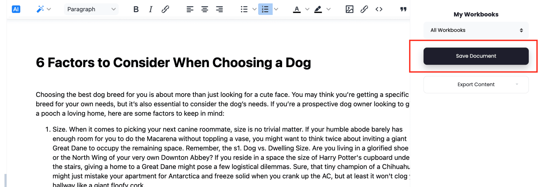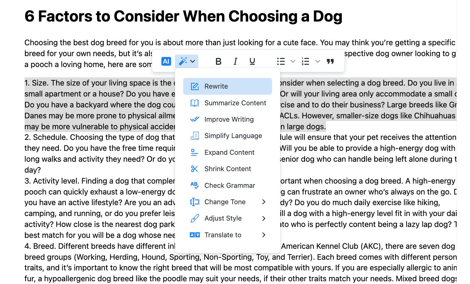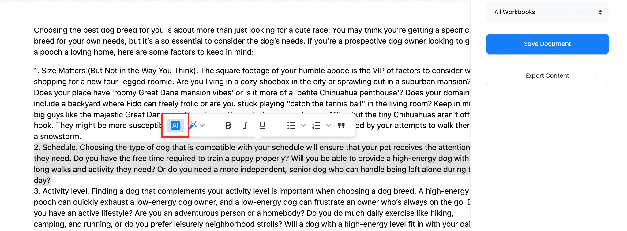 4.- Use the AI Assistant to give specific instructions. If you wish to be more specific on your instructions to the AI or need a change that is not included on the Wizard, you can use the AI Assistant instead. Just keep on mind that ti will make changes on the whole text, not only the selected section. To open it, click on the AI icon on the menu.