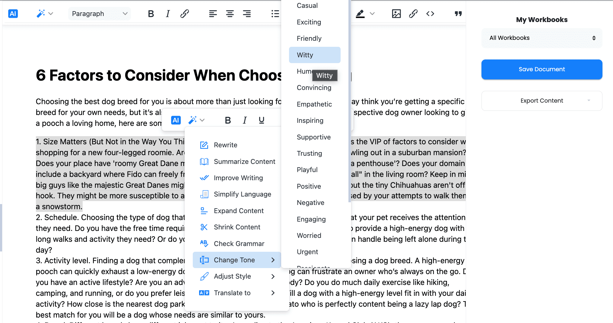 3.- Use the wizard to make AI quick editions. Select the paragraph you wish to edit. On the menu, click on the wand icon to open the Wizard toolkit.