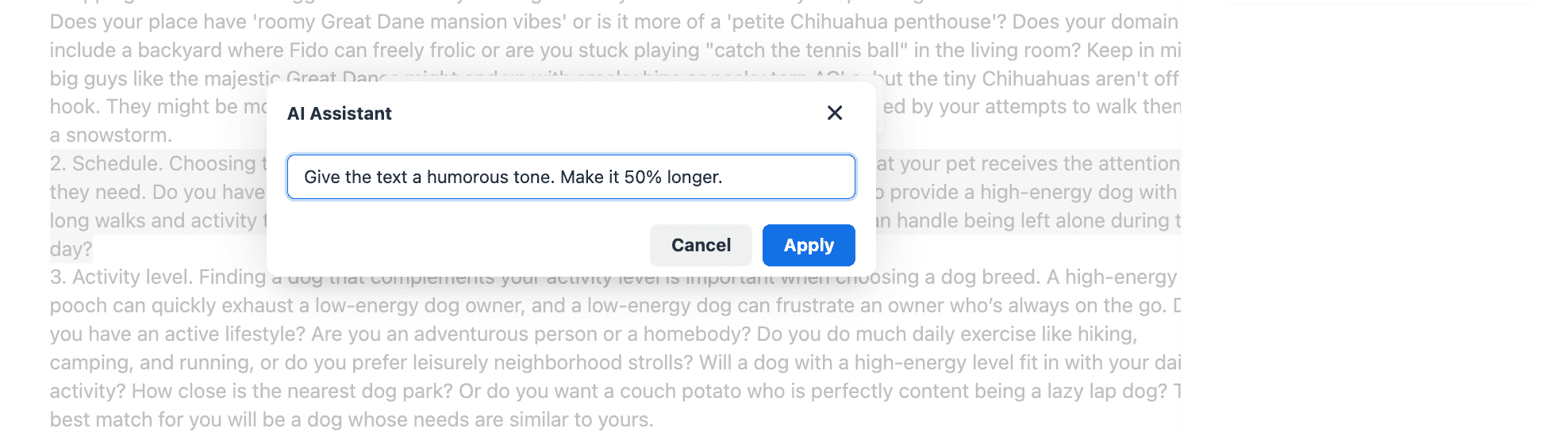 Describe the changes you need. Include as many details as possible for better results. When done, click on ‘Apply’ and wait a few seconds for the AI to deliver the results.