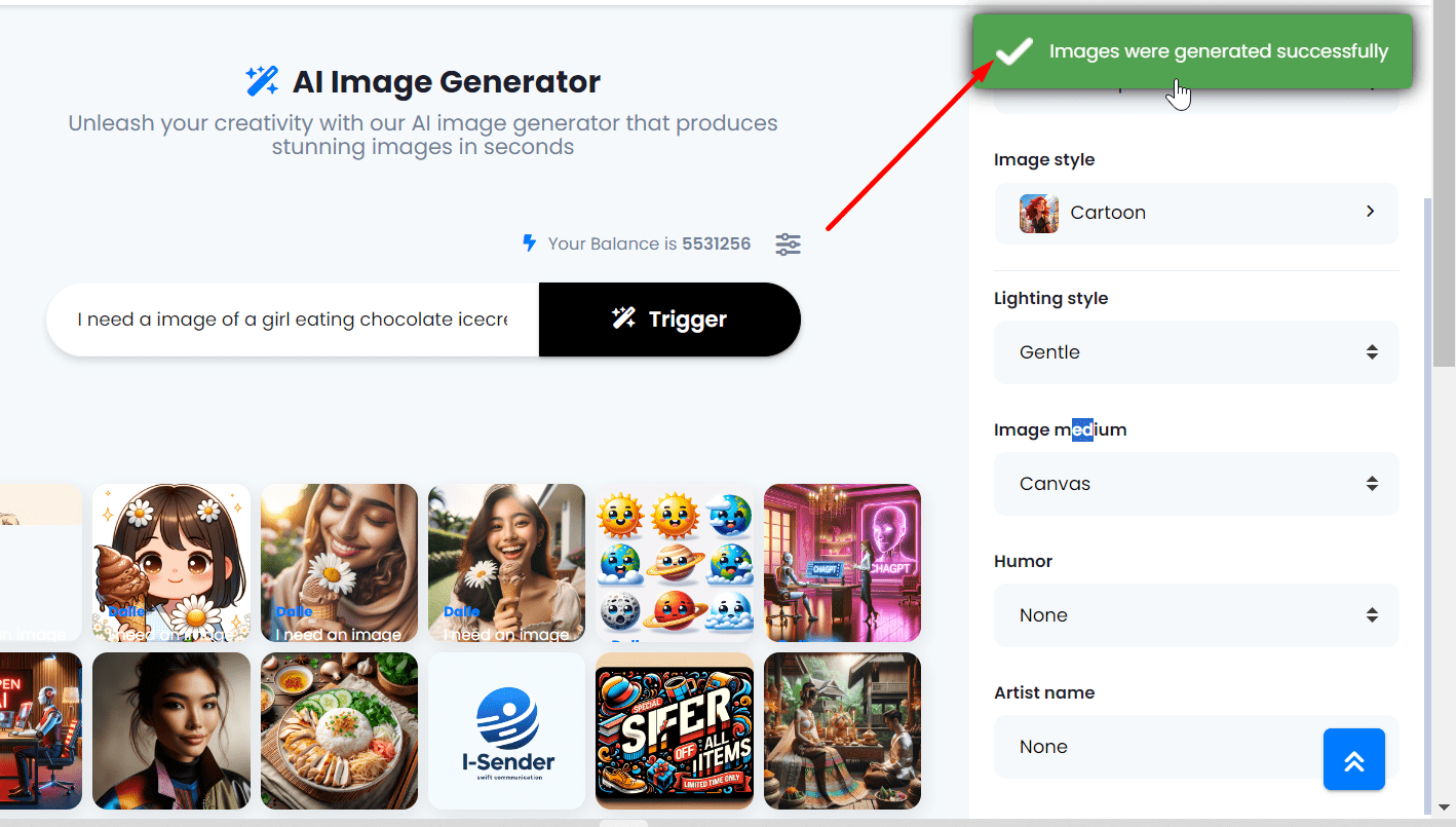 6. Confirmation of Generation: Once the image has been successfully generated, a green-lettered message will appear in the upper-right corner of the screen, and the image will be displayed in the space below, alongside those previously generated.