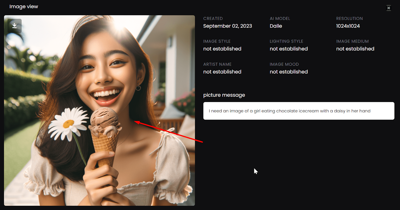 9. Details of Generated File: If you wish to obtain more detailed information, click on “View Image.” Here, you will find specifics such as size, resolution, and the description used for generating the image.