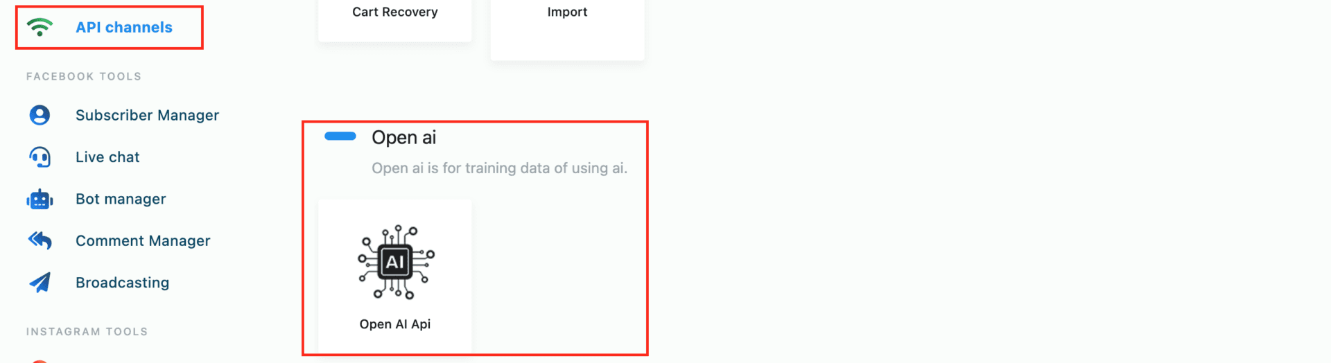 1.- Open the API Settings. Log into your SalesBot Account. Click on API Channels and scroll down to the OpenAI API section. Click on it.