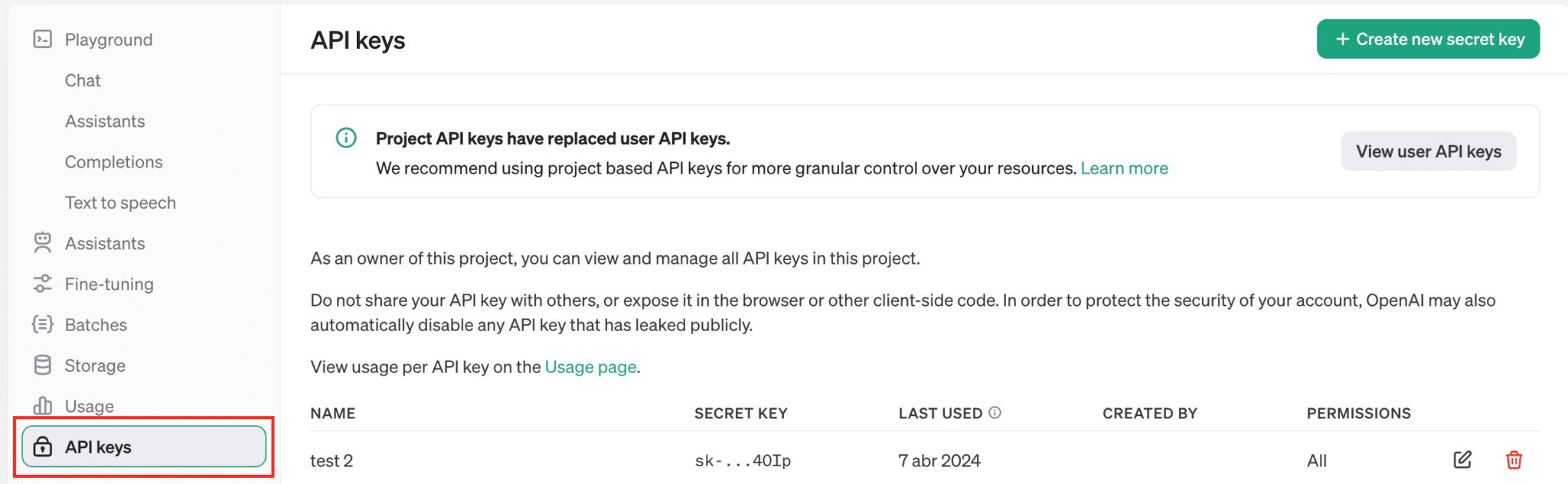 2.- Generate a Secret Key. On the left sidebar, select API Keys. Then, click on ‘Create new secret key’ at the top right corner.
