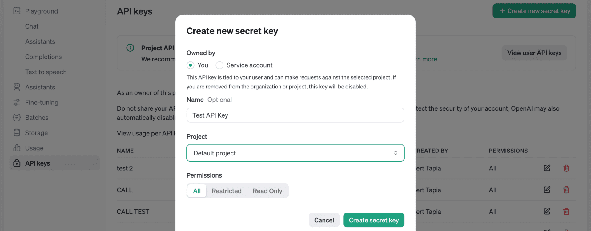 On Owned By, select ‘You’. Give your key a name to identify it. Optionally, select a Project to link it. On Permissions, select ‘All’ and click on ‘Create’. Copy the code that will appear and save it somewhere safe. After you close this window, you will not be able to see it again.
