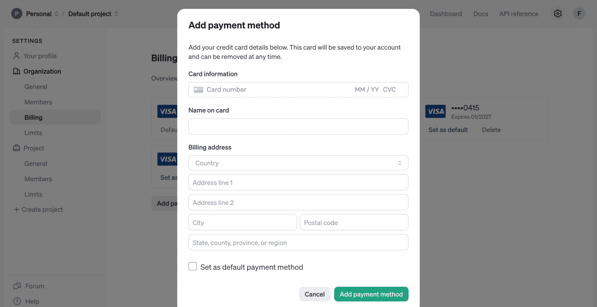 Once inside the Payment Methods section, click on the ‘Add Payment Method’ button. Add your credit card information. Optionally, set it as your default payment method and save.