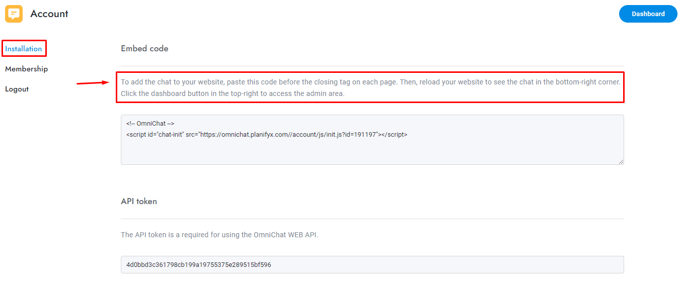 3 Go to Installation. You’ll find the embed code needed to add your widget chat to your website. Above the code, you’ll find more detailed instructions for connecting your widget chat.