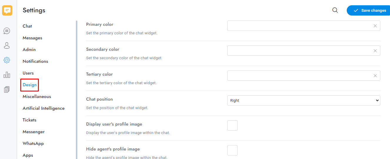 2 Click on design option: There you can customize the widget chat.