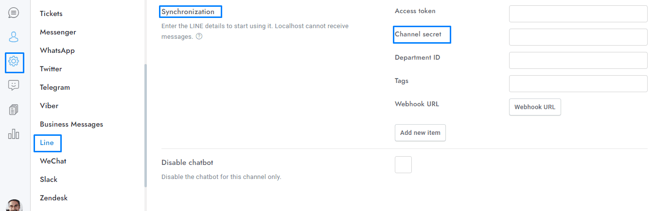 - From the channel Basic settings area copy Channel secret and paste it into Chat > Settings > Line > Synchronization > Channel secret.