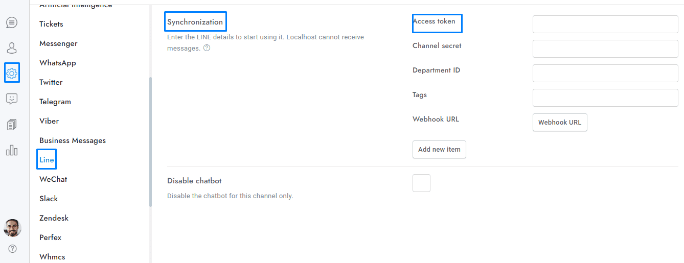 - From the channel Messaging API area generate a Channel access token (long-lived), copy it and paste it into Chat > Settings > Line > Synchronization > Access token.