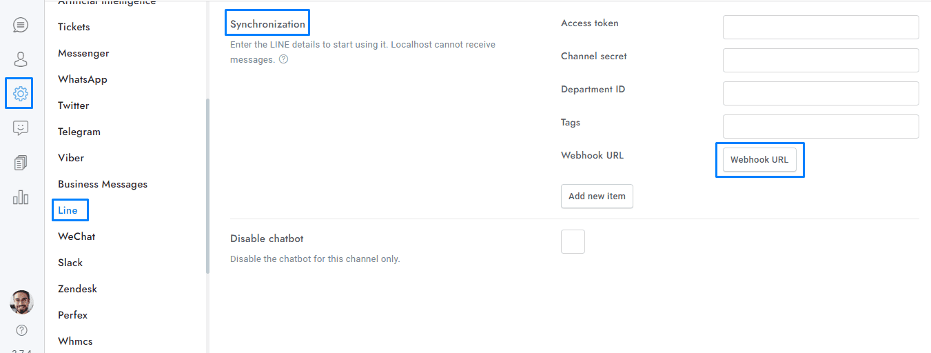- Enter your Webhook URL into Webhook URL and click Verify. Get the Webhook URL from Chat > Settings > Line > Synchronization > Webhook URL.