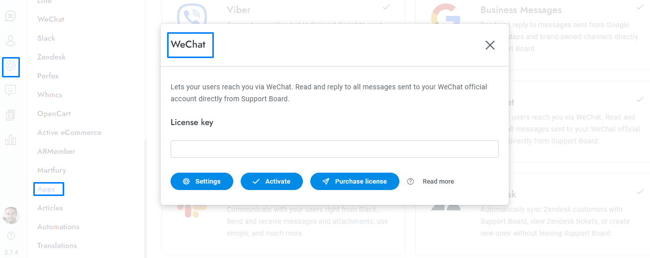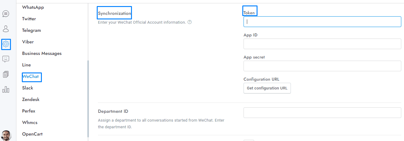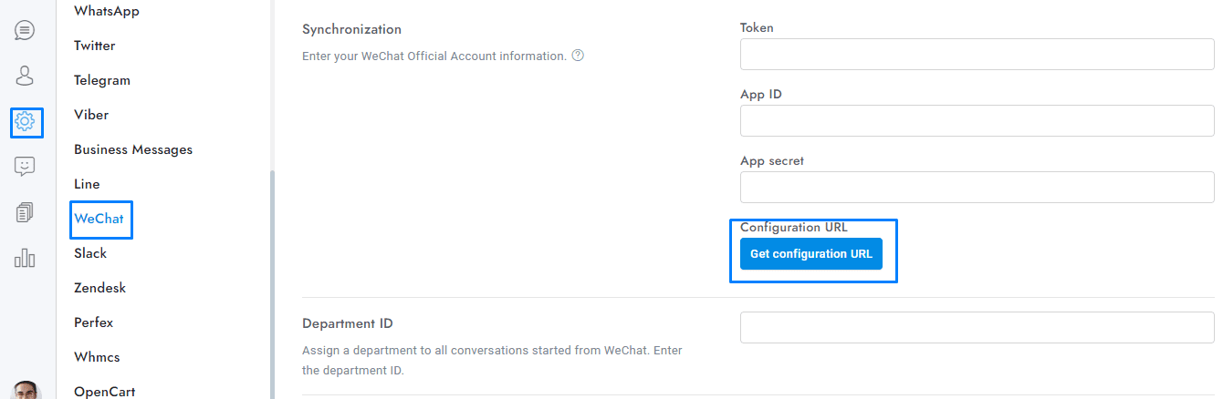 - From the left menu click Settings and development > Basic configuration and copy Developer ID(App ID), Developer Password(App Secret). Paste the information into Chat > Settings > WeChat.