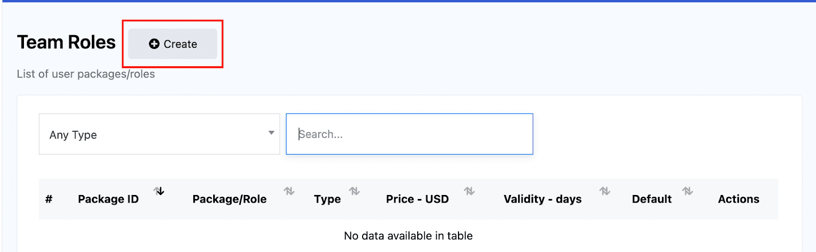 Inside the Team Roles Page, tap on Create.