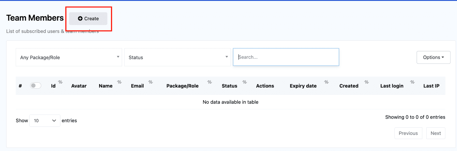 On the Team Members page, click on Create.