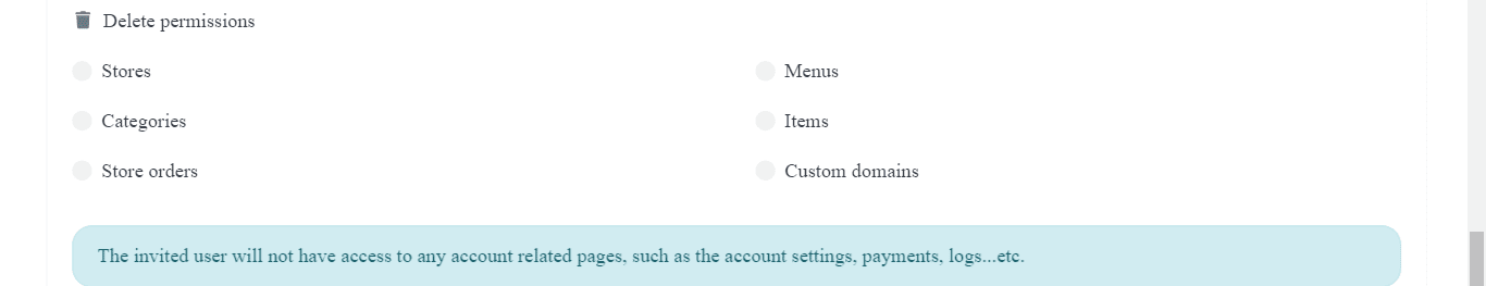 💡 Keep in mind that the invited user will not have access to any account related pages, such as the account settings, payments and logs. You cannot grant them those permissions, since they are exclusive of your administrator account.