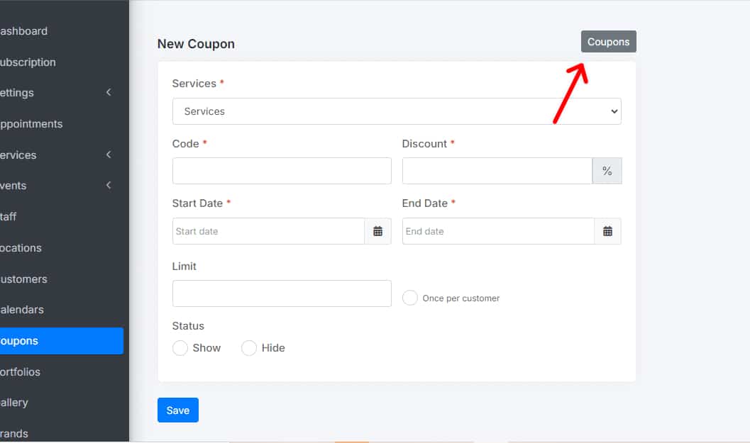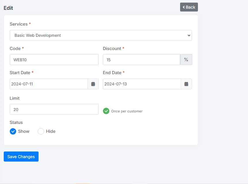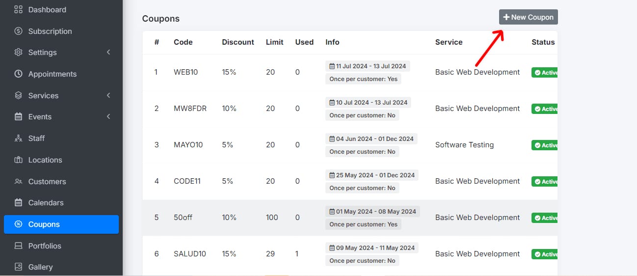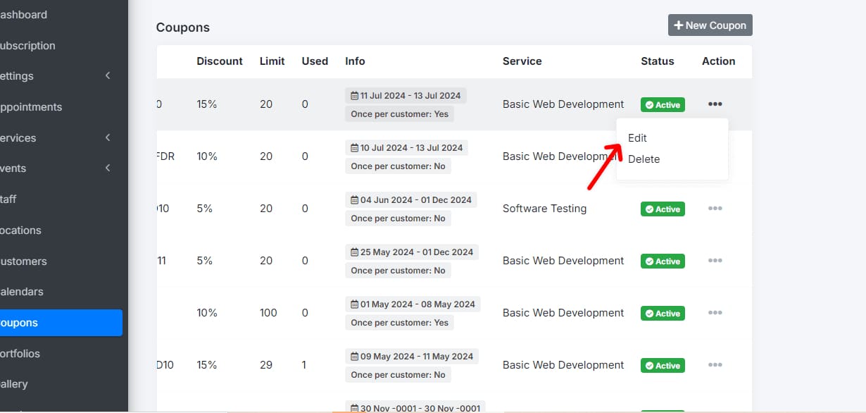 Select the coupon you want to edit. Modify the necessary fields, such as the associated service, coupon code, discount percentage, or available dates.