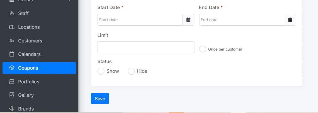 Add a Field Validation: Ensure all required fields are completed and correct before saving a new coupon or editing an existing one.