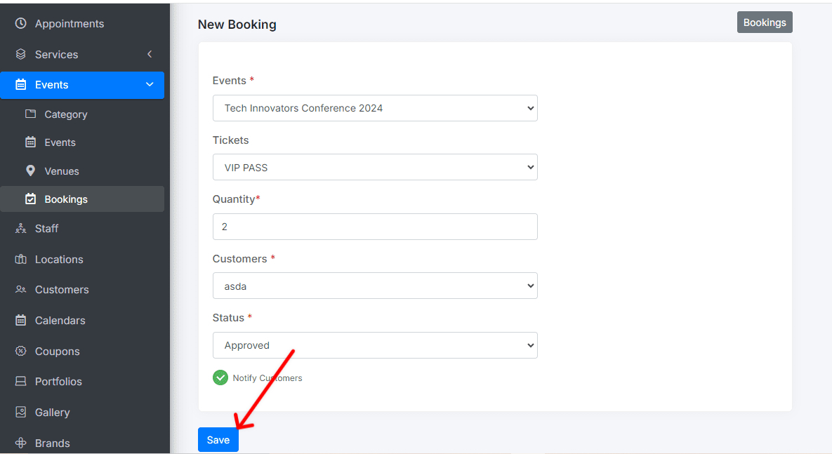 Save booking: Click Save to confirm the reservation.
