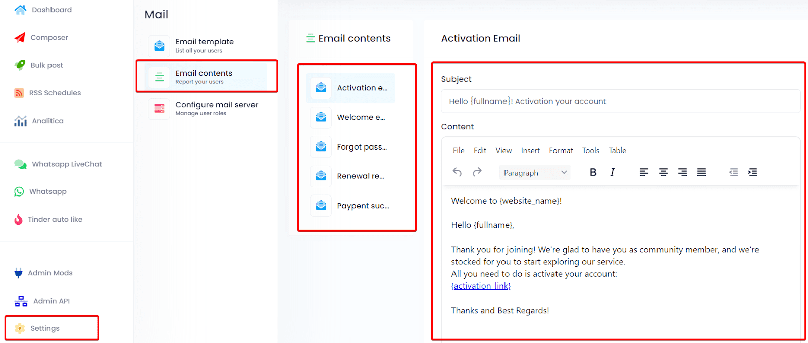 2. In the ‘Email contents’ column, you’ll find all the templates that come by default with the application. Here, you can modify their content (even translate them).