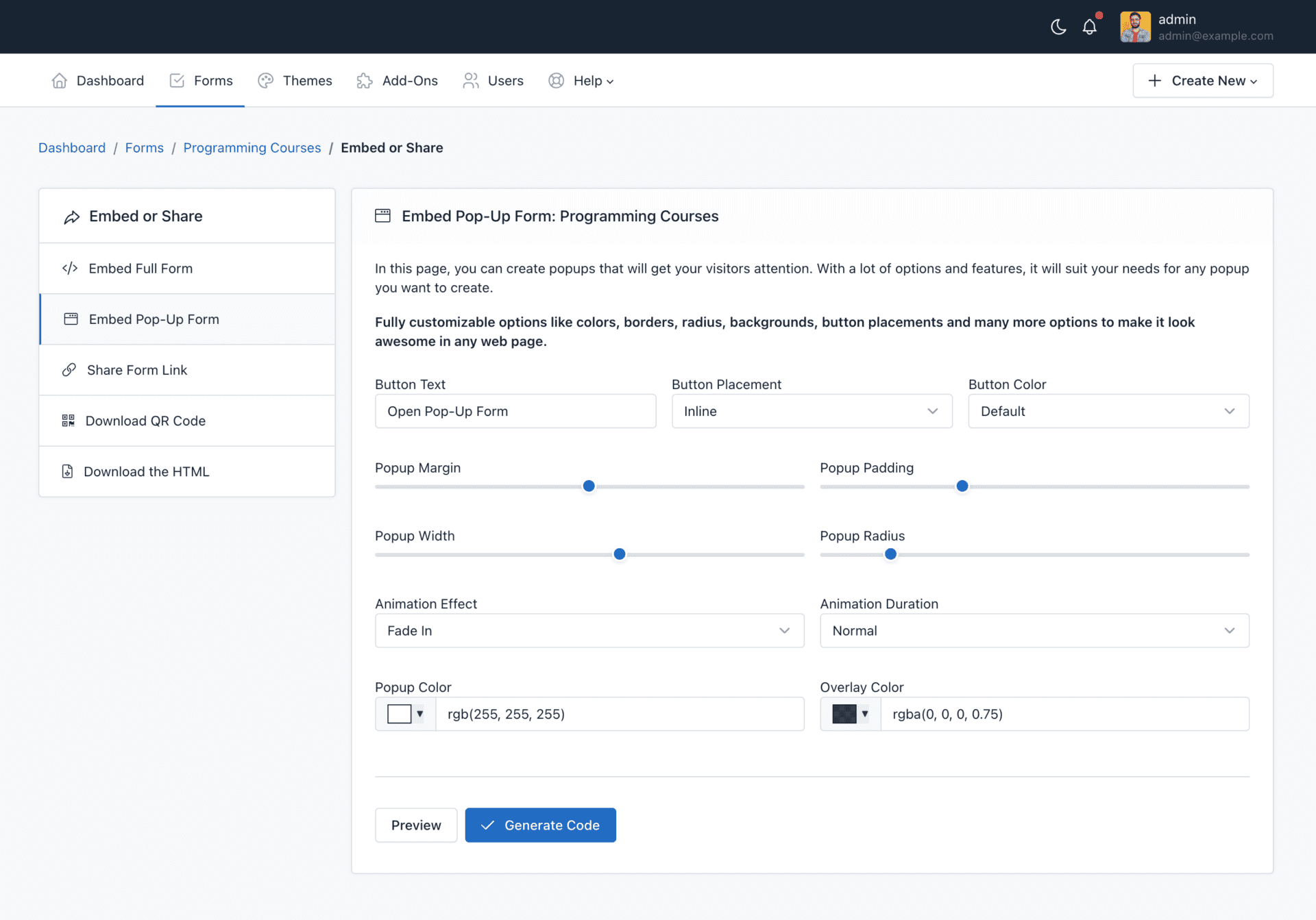 To finish, click on the “Generate code” button to open a modal and copy the HTML code that you must insert in your web page.