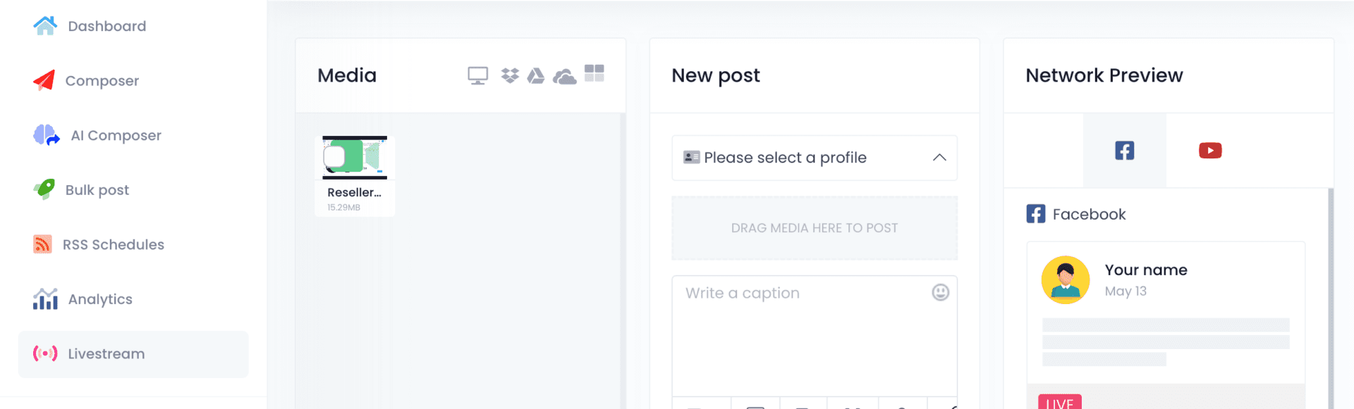 Once you have your videos ready, utilizing our app for livestream programming couldn’t be simpler. Just navigate to the Livestream option on the left sidebar and follow the same intuitive steps as in the Composer feature to schedule content across one or multiple YouTube and Facebook accounts simultaneously.