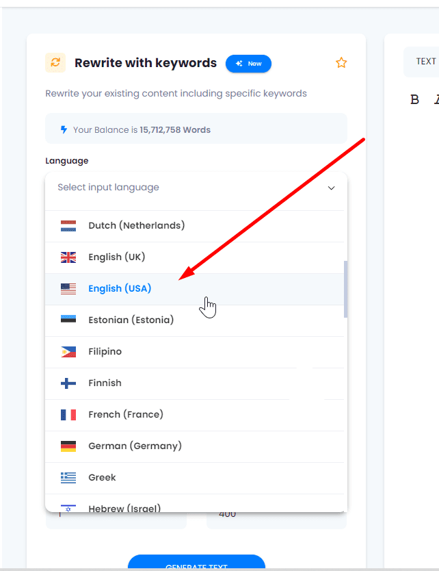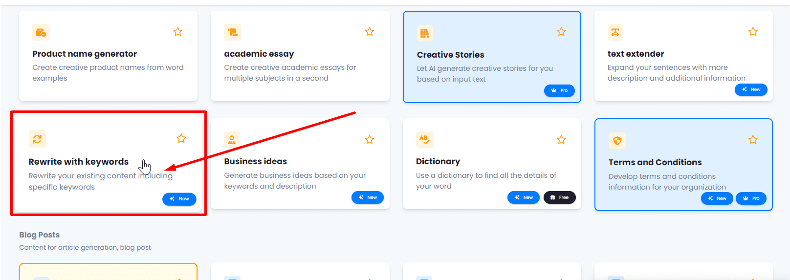 2.- Find the “Rewrite with Keyword” Option. Within the Templates, locate and click on the box that says “Rewrite with keyword”.