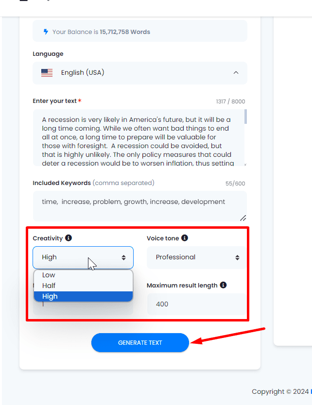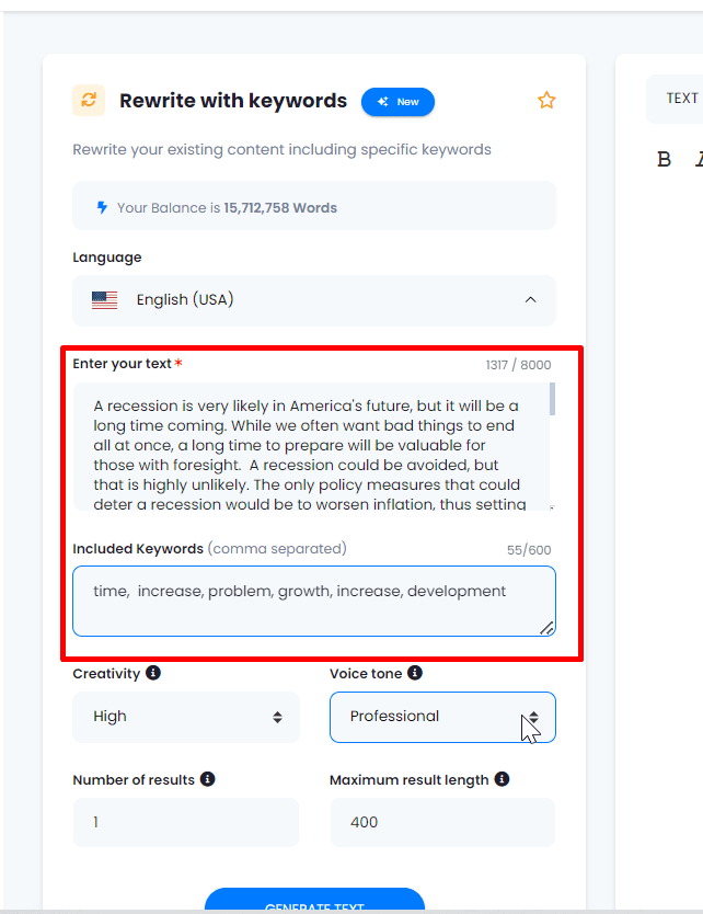 7.- Generate the Text. After configuring the settings, click on “Generate text.” The tool will generate a new version of the text, incorporating the selected keywords.