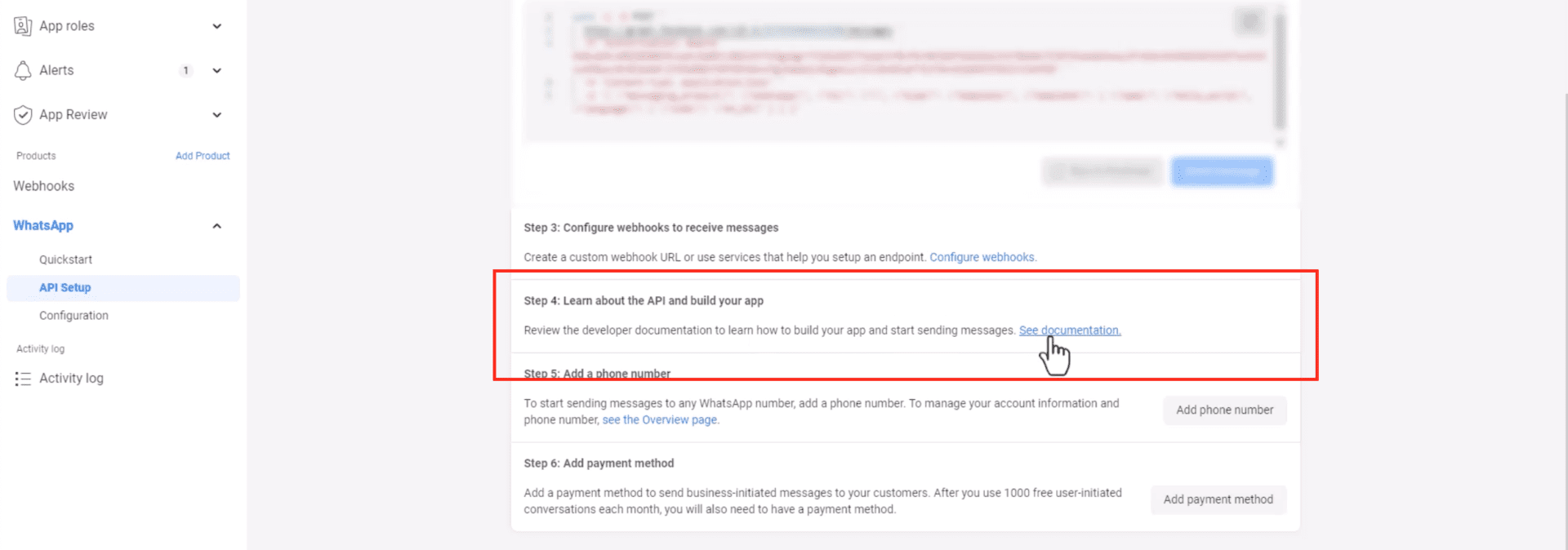 Open Your Meta Developers Account. Start by opening your Meta Developers Account, which you used to connect your WhatsApp account to our chatbot app. On the left sidebar, click on “WhatsApp” and then “API Setup.”