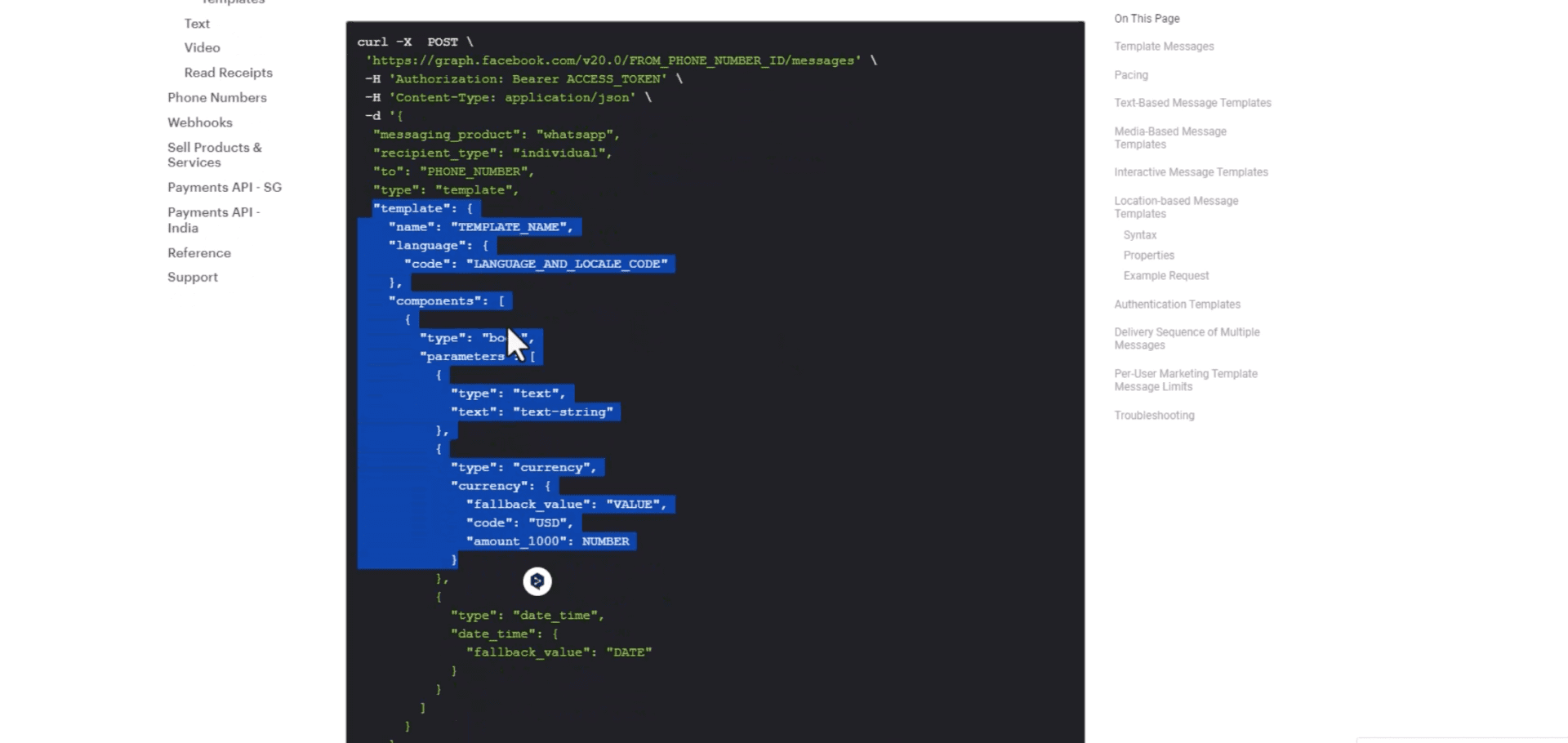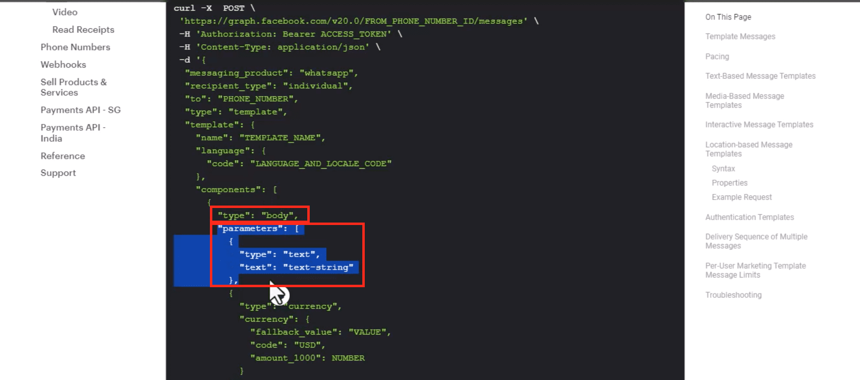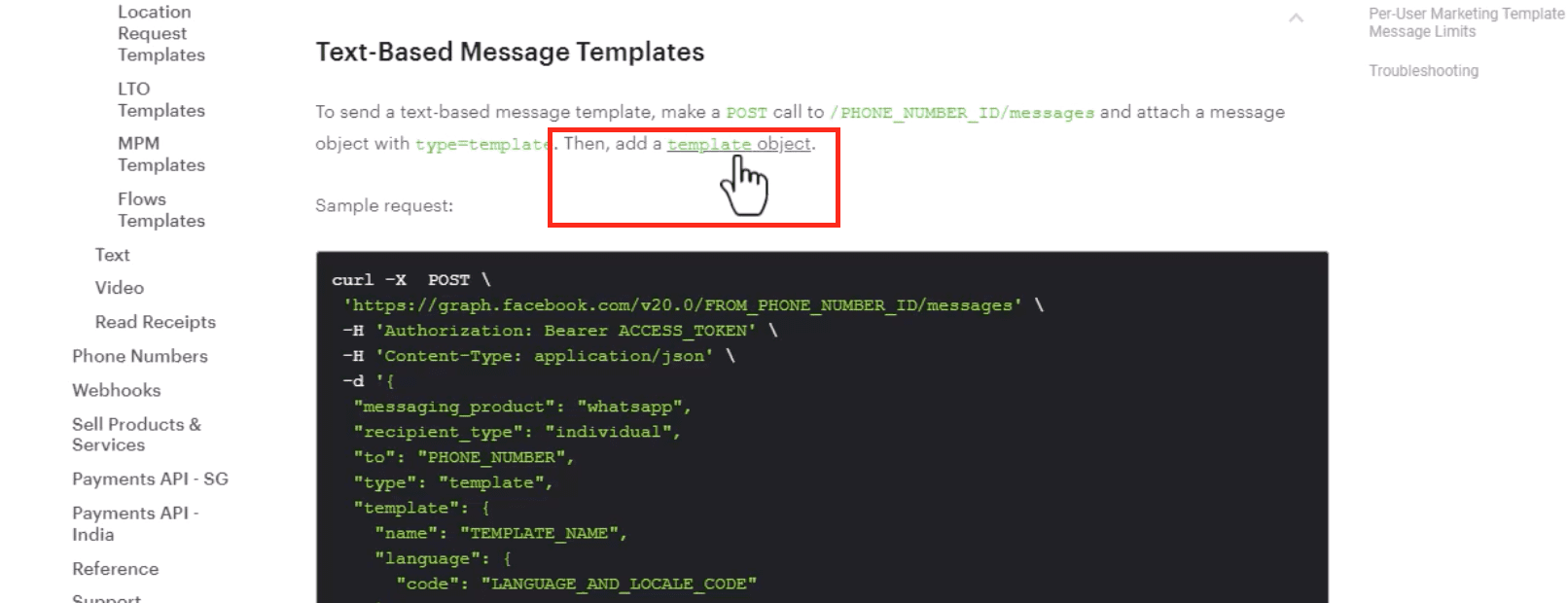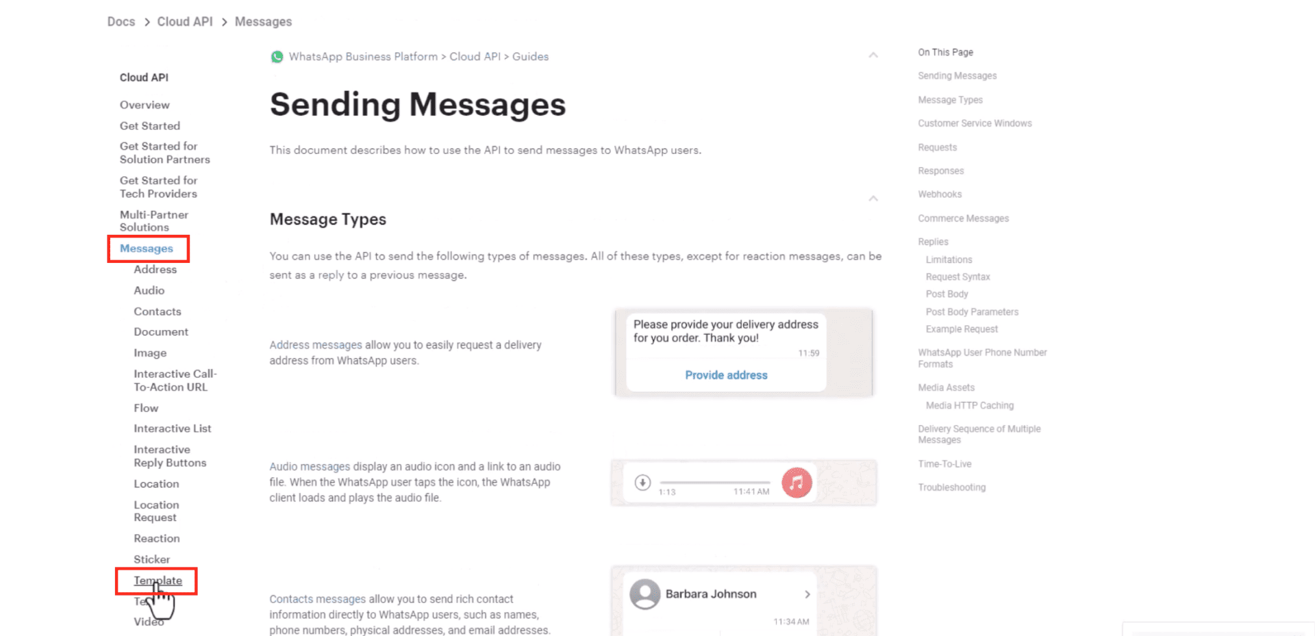 Explore the Messages Section. In Meta’s documentation, navigate to the messages section, then to Templates. This section covers the basics of sending a template message through the app.