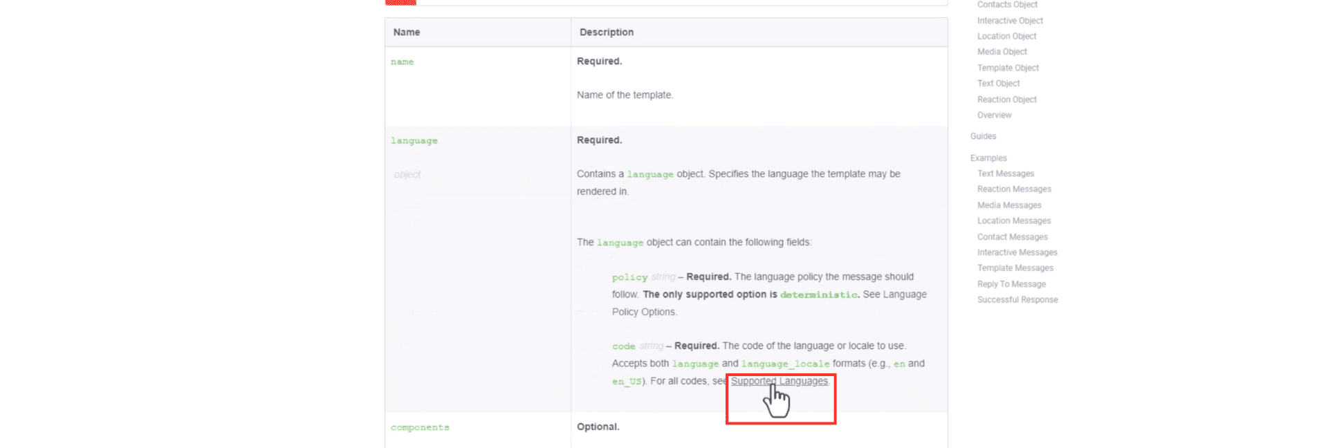 Access the Template Object. For the language section, a code will be required. Click on “Template Object” and open it in a new tab. This page shows the properties a template can have.