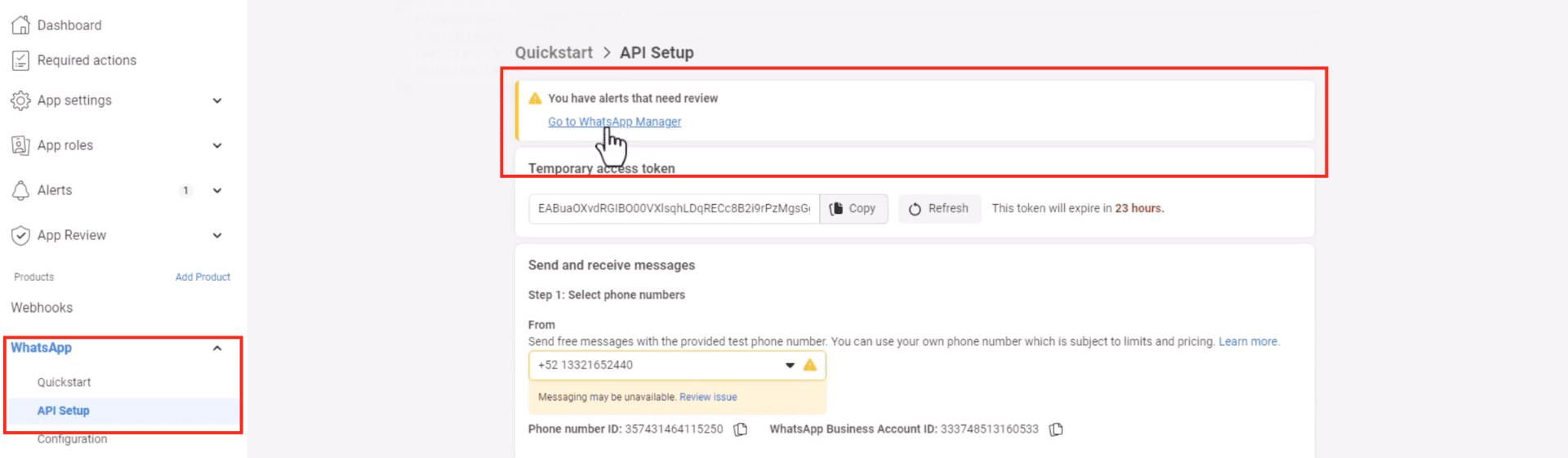 Open the WhatsApp Manager. Go back to the API Setup section in your Meta Developers Account. Open the WhatsApp Manager as shown in the image below. If the button isn’t visible, use this link.