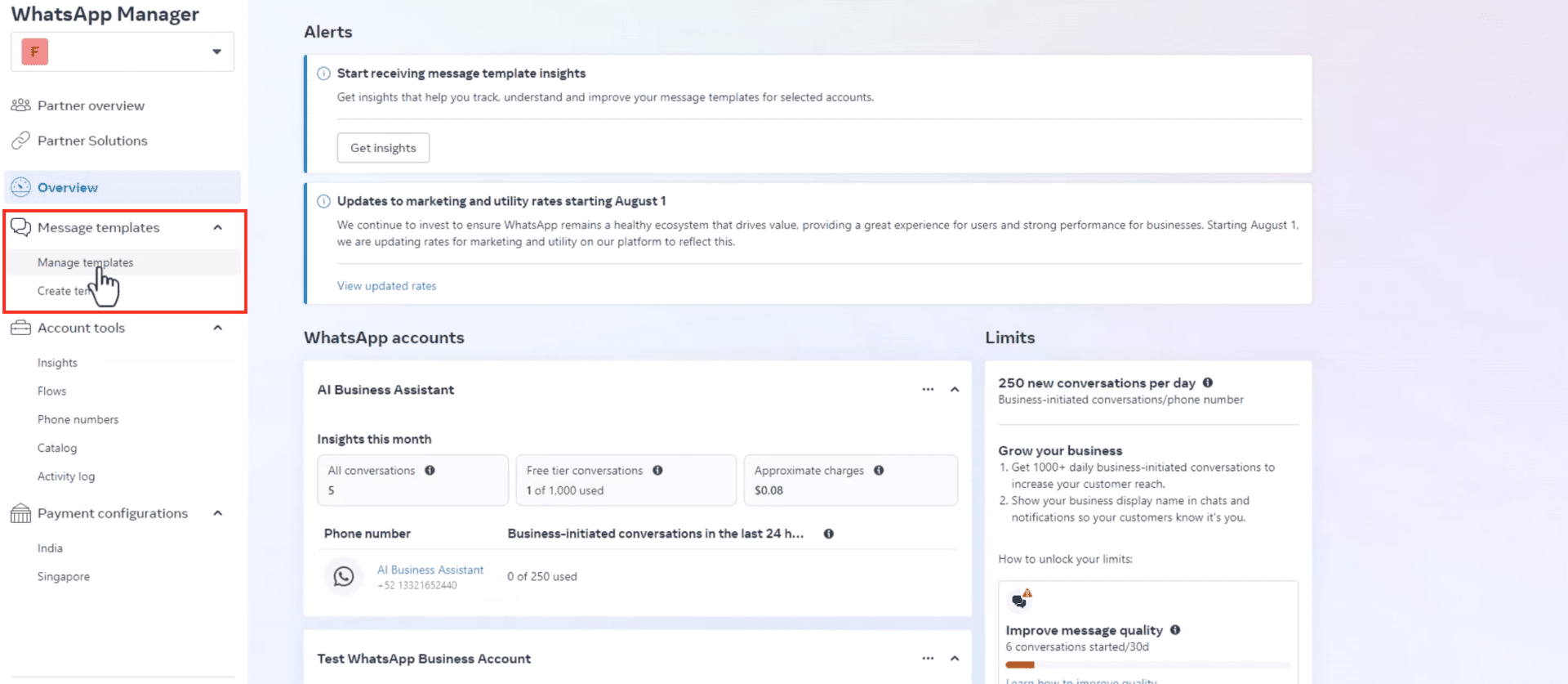 Open the WhatsApp Template Manager. Navigate to the template manager in the left sidebar.