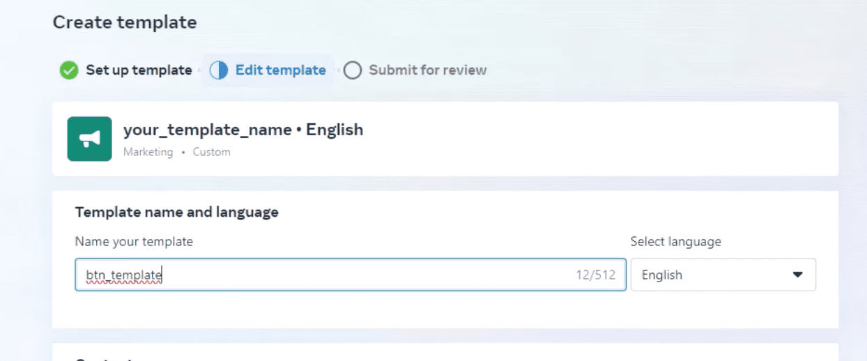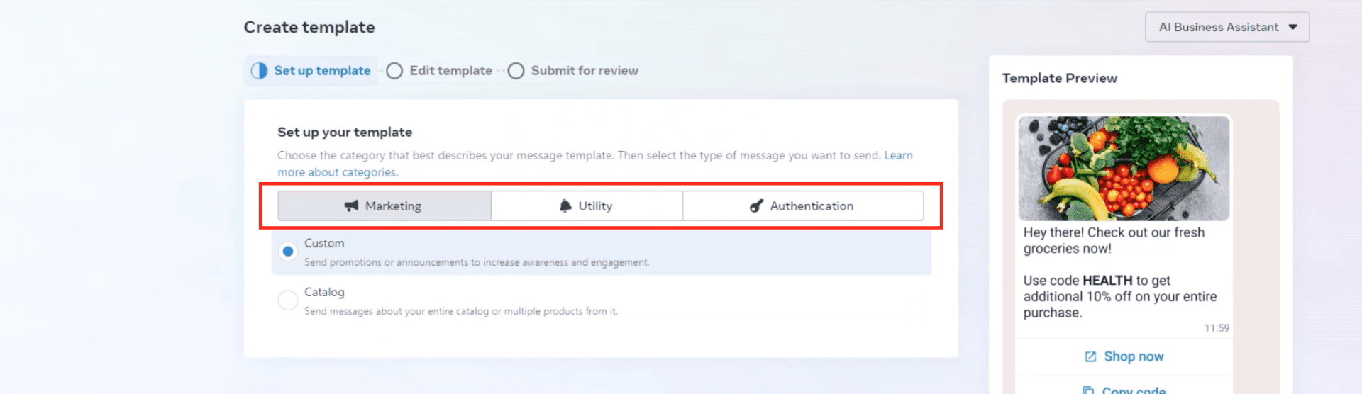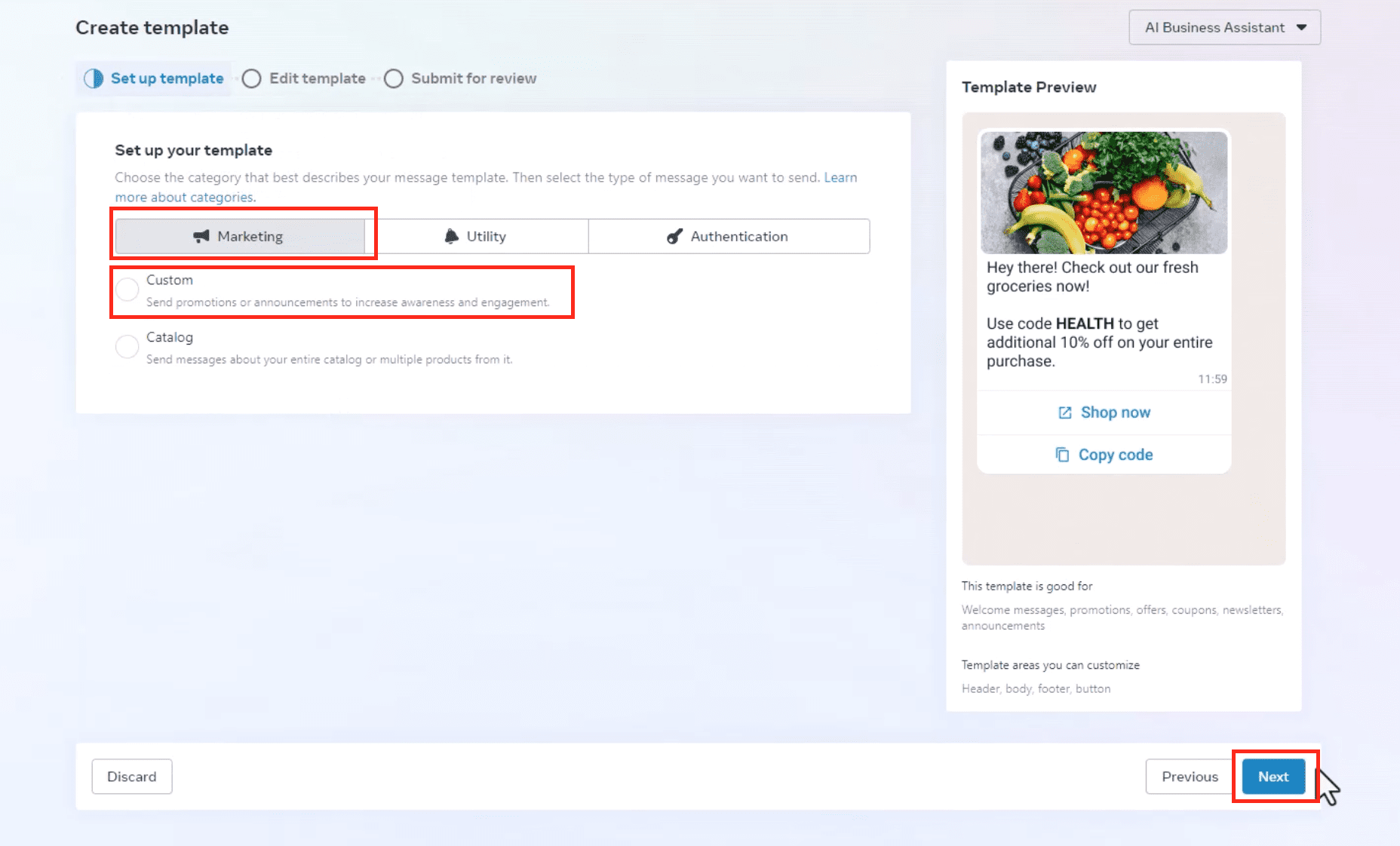 Create a Template with an Image. To do it, create a new template in Meta’s Template Manager. Once again, select the Marketing and Custom options in the Set Up screen.