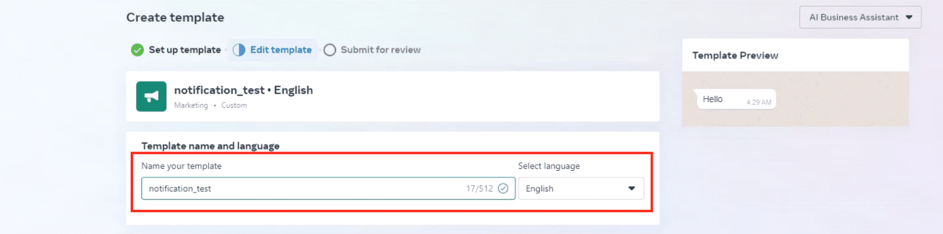 Submit the template for review. After reviewing your setup, click “Submit for review,” confirm the details, and proceed. Wait for the approval from Meta. Once approved, the template will be ready for use. Once again, copy the template name.