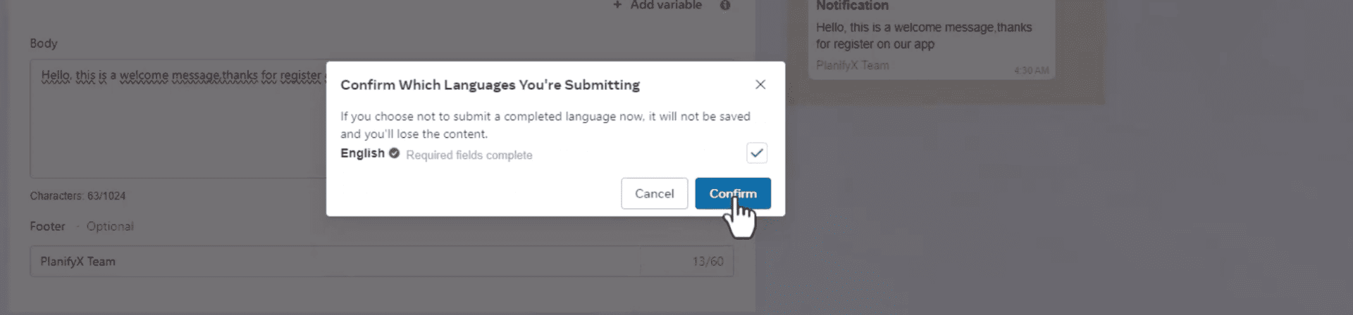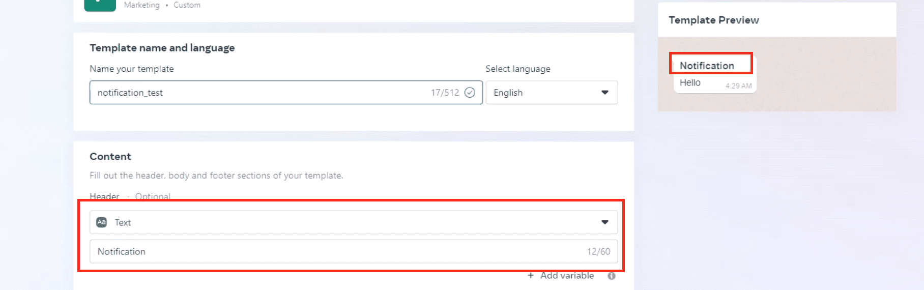 Set Template Details. Name the template, for example, “notification test,” and select the language—defaulting to English.