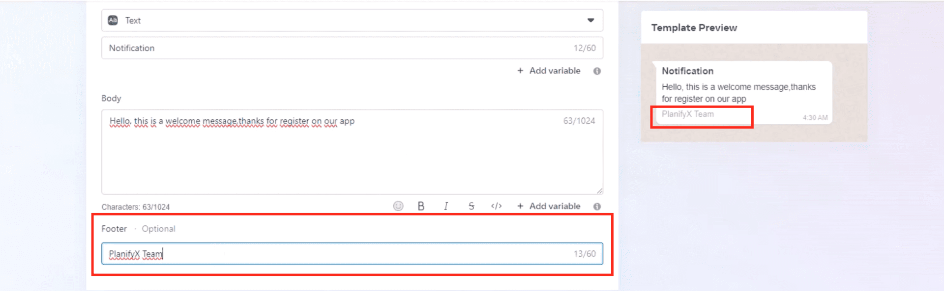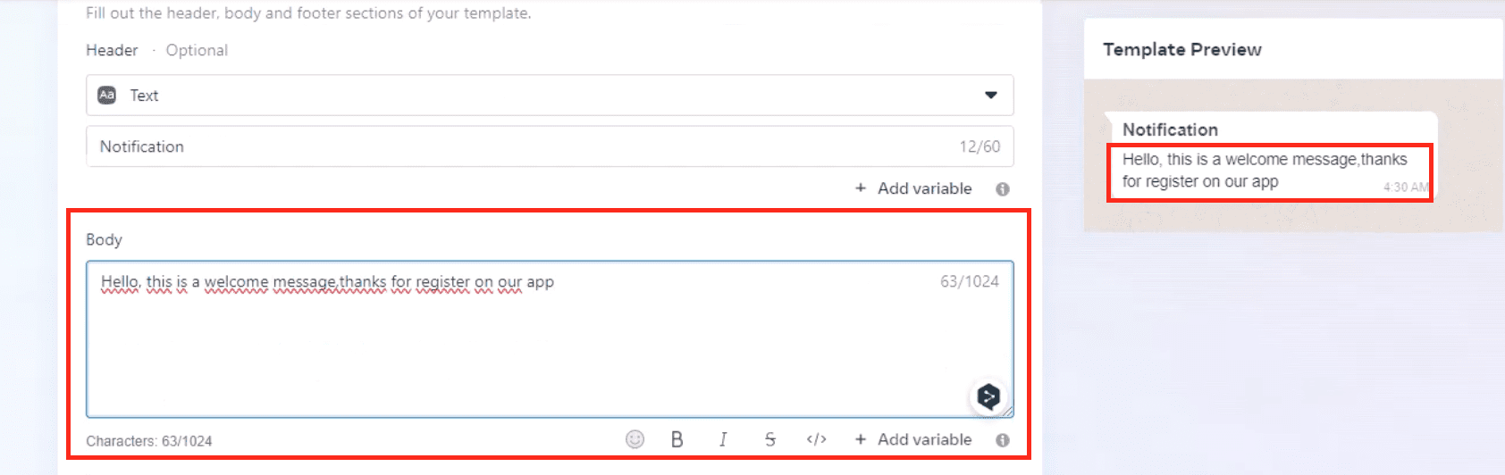 Enter Template Details. Add a header to your template. For this example, we’ll use plain text and include some text with variables in the header. In the body of the message, include sample text similar to what we’ve used in previous templates. Additionally, you can add a footer to the message for extra context or branding.