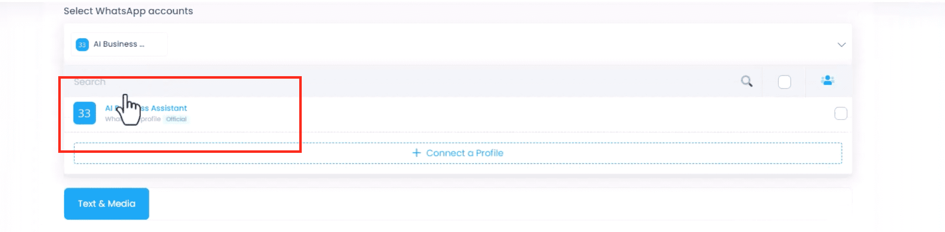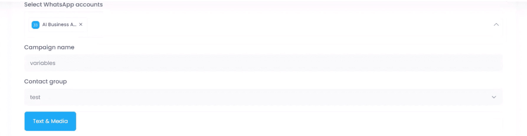Configure Campaign Details. Select your linked WhatsApp account, name the campaign, and choose your contact group. In this example, we used a contact group containing only one phone number for testing.