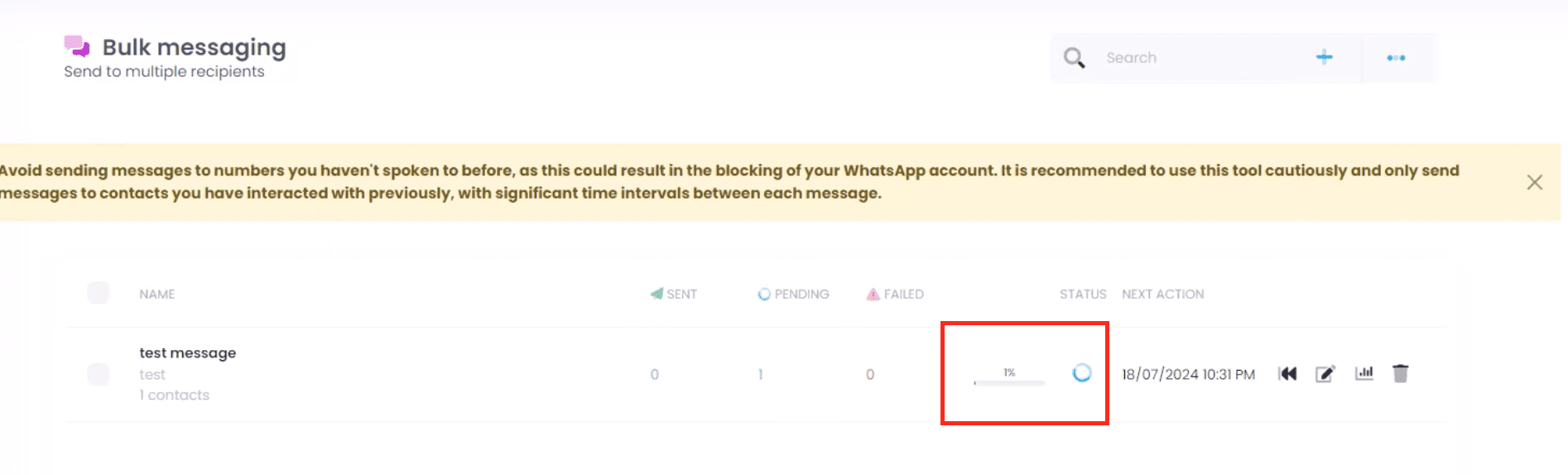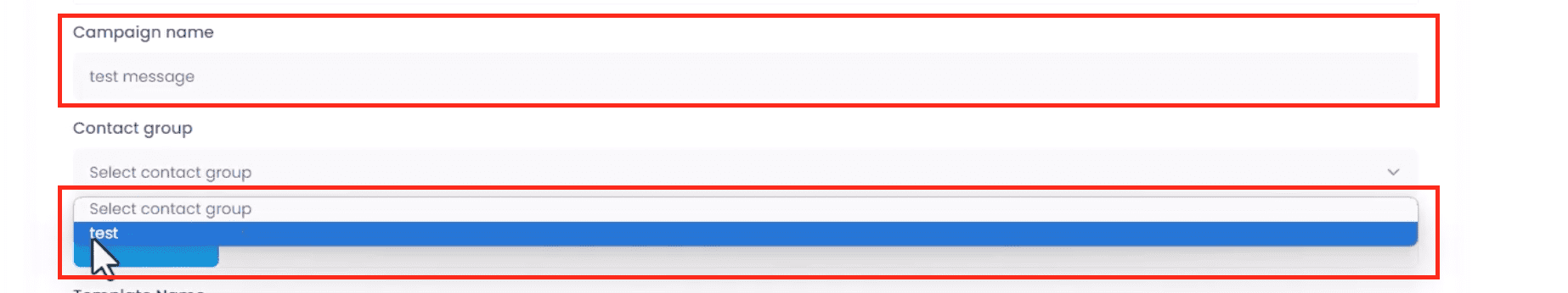 Link the Template to the App. Go back to the WhatsApp section and create a new bulk campaign. Select an account, give it a name and select a contact group to receive it. As before, paste the template name exactly as you wrote in Meta, and enter the language code.