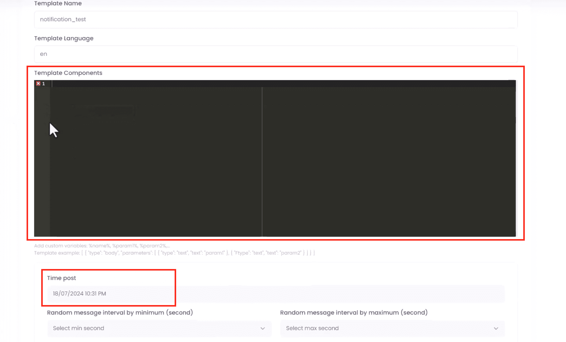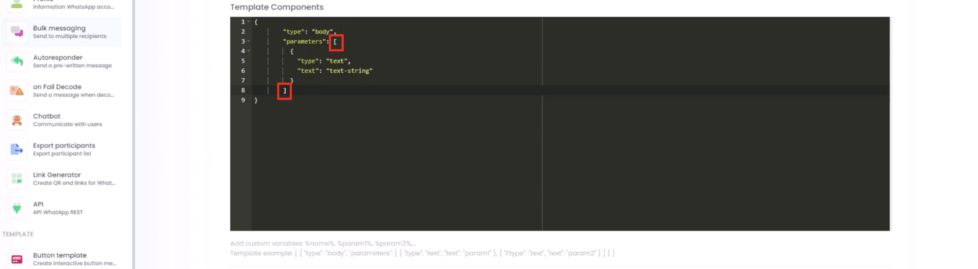 Enter your template details. Then, go back to your bulk campaign and paste the JSON code into the Templates Components Box. Follow the instructions in the Cloud API documentation for configuring the brackets (you can also review what we did earlier in this tutorial). Ensure that all brackets are correctly paired—every opening bracket must have a corresponding closing bracket.