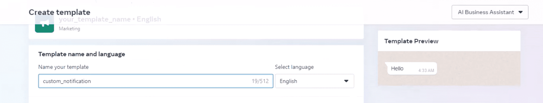 Create a Template with Variables. To add variables, create a new template in the Business account, select marketing and custom.