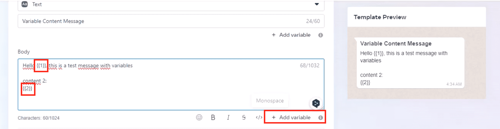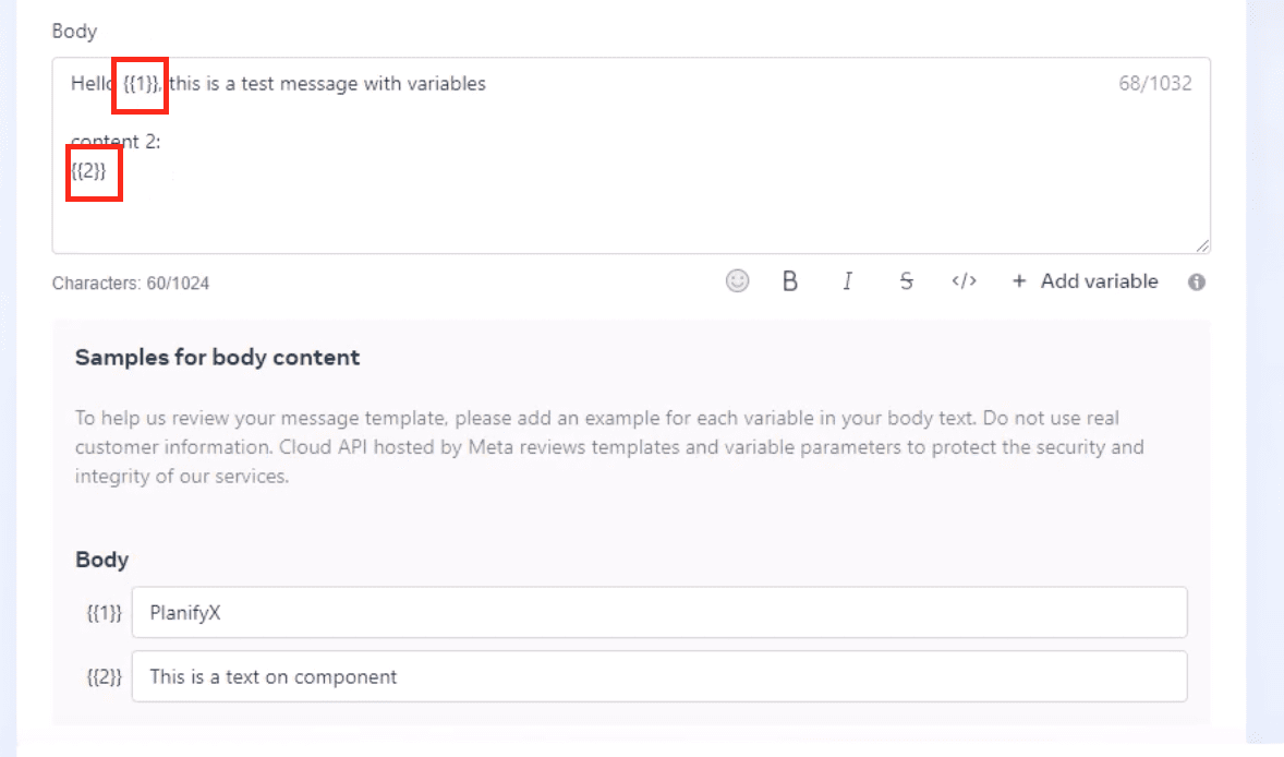Add a header, and a body. Finally, include variables in the message body using double curly braces. For example, {{1}} and {{2}}.