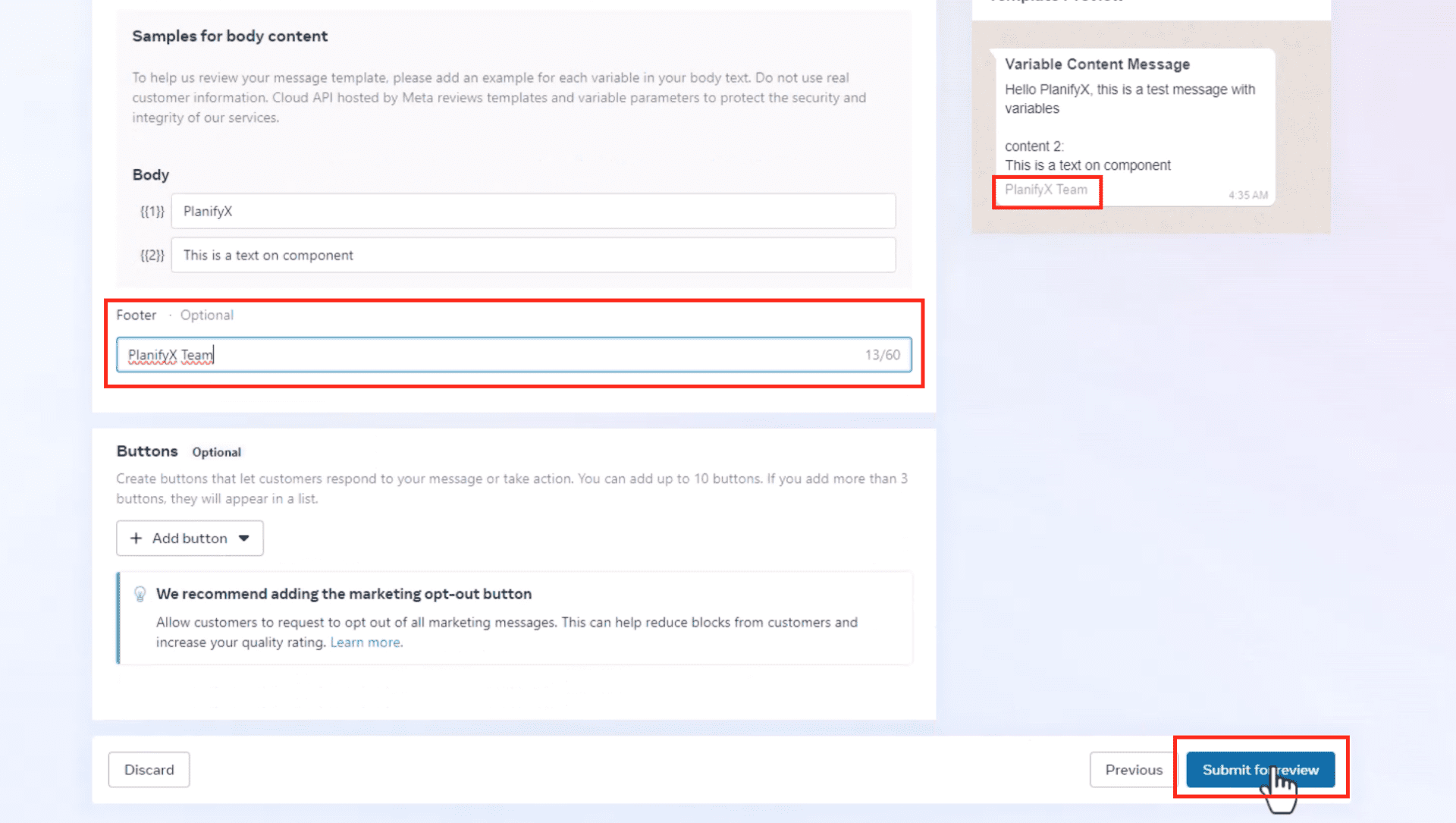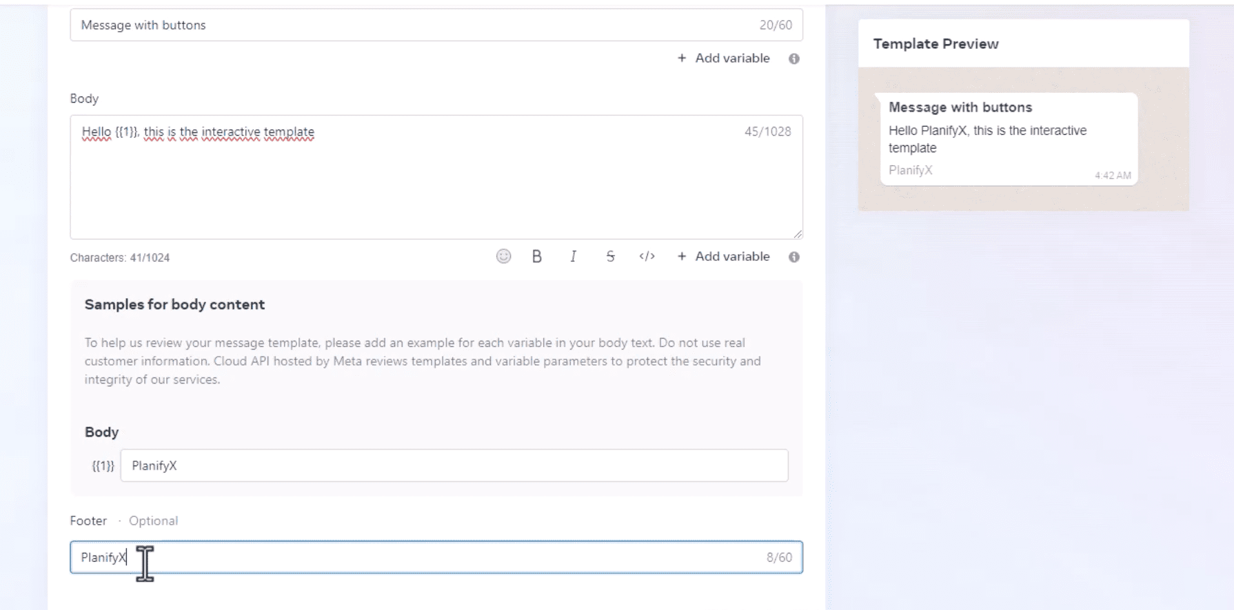 Then, add the body of your message. You can include variables here, as seen in previously. Optionally, add a footer and buttons too.