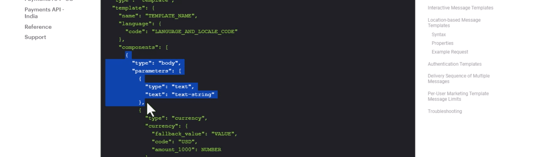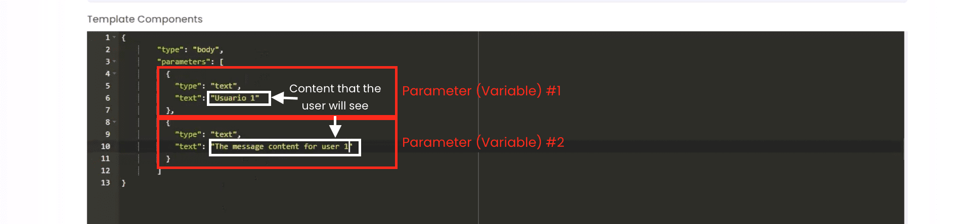 Refer to Cloud API Documentation. Go back to the Cloud API documentation to check the required format. According to the documentation, you need to use Body type components and parameters structured as shown in the image below. This image illustrates the correct structure for setting up these components.