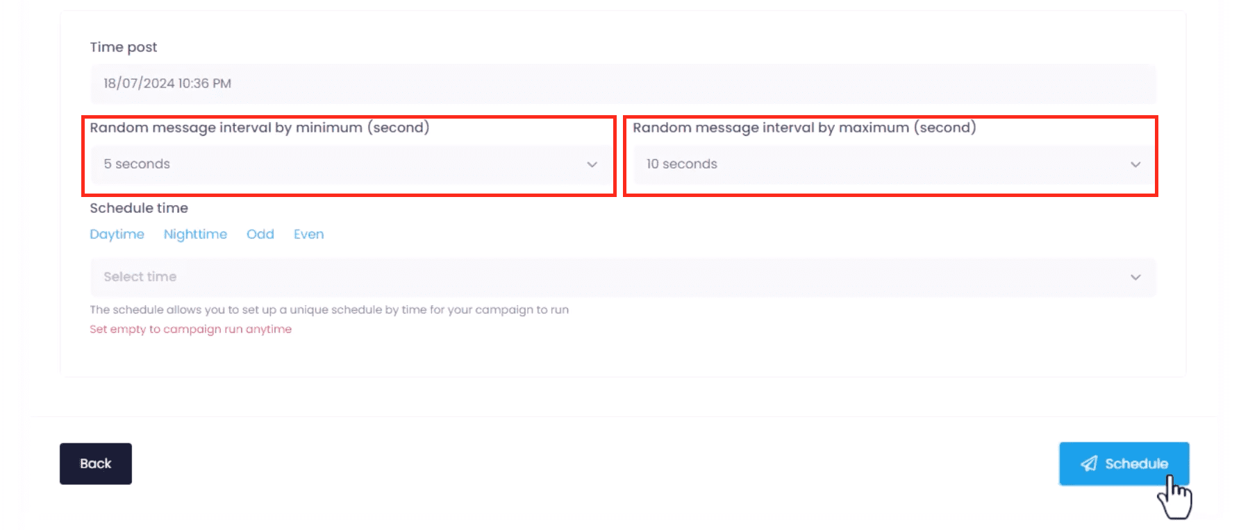 Set Timing and Schedule. Once the parameters are configured, set the timing for sending the messages, such as 5 or 10 seconds. Then, click the schedule button to proceed.
