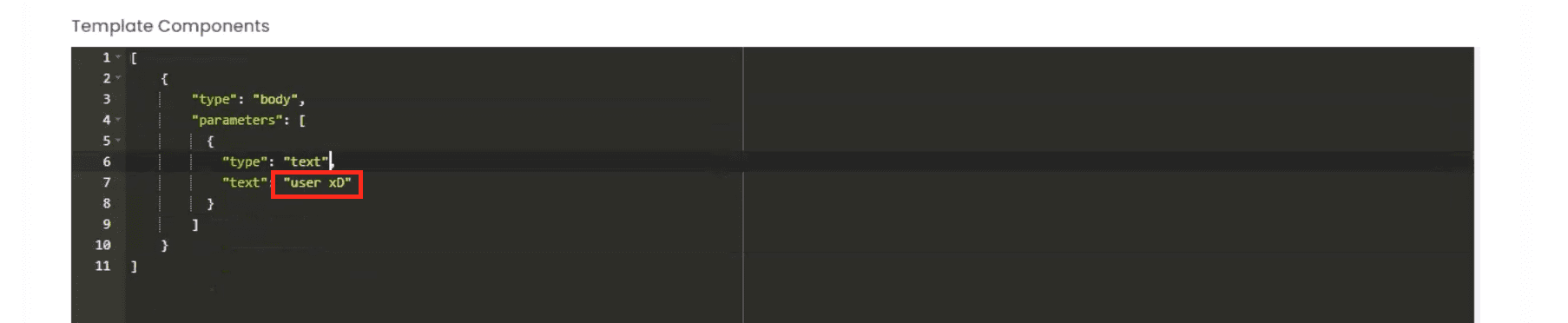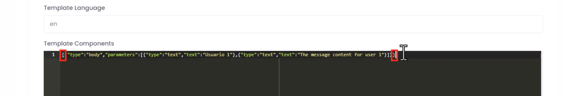 Correcting the JSON Format. Check Meta’s documentation to ensure all components are placed correctly. In the example, we missed that all components must start and end with square brackets. The image below shows a correct JSON format. Once corrected, reschedule the campaign.