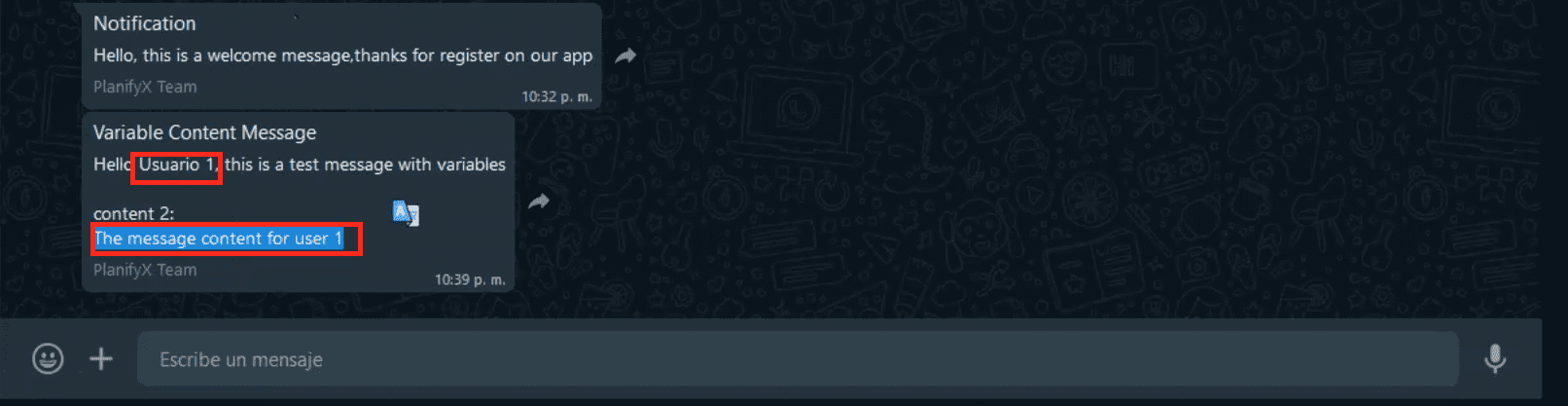Confirming Receipt. Once the message is received, you’ll see the template with the variables filled in, as configured. The header “variable content message” and the specific variable text like “user 1” should appear correctly. This process confirms that the bulk send using variables and a template has been successfully executed.