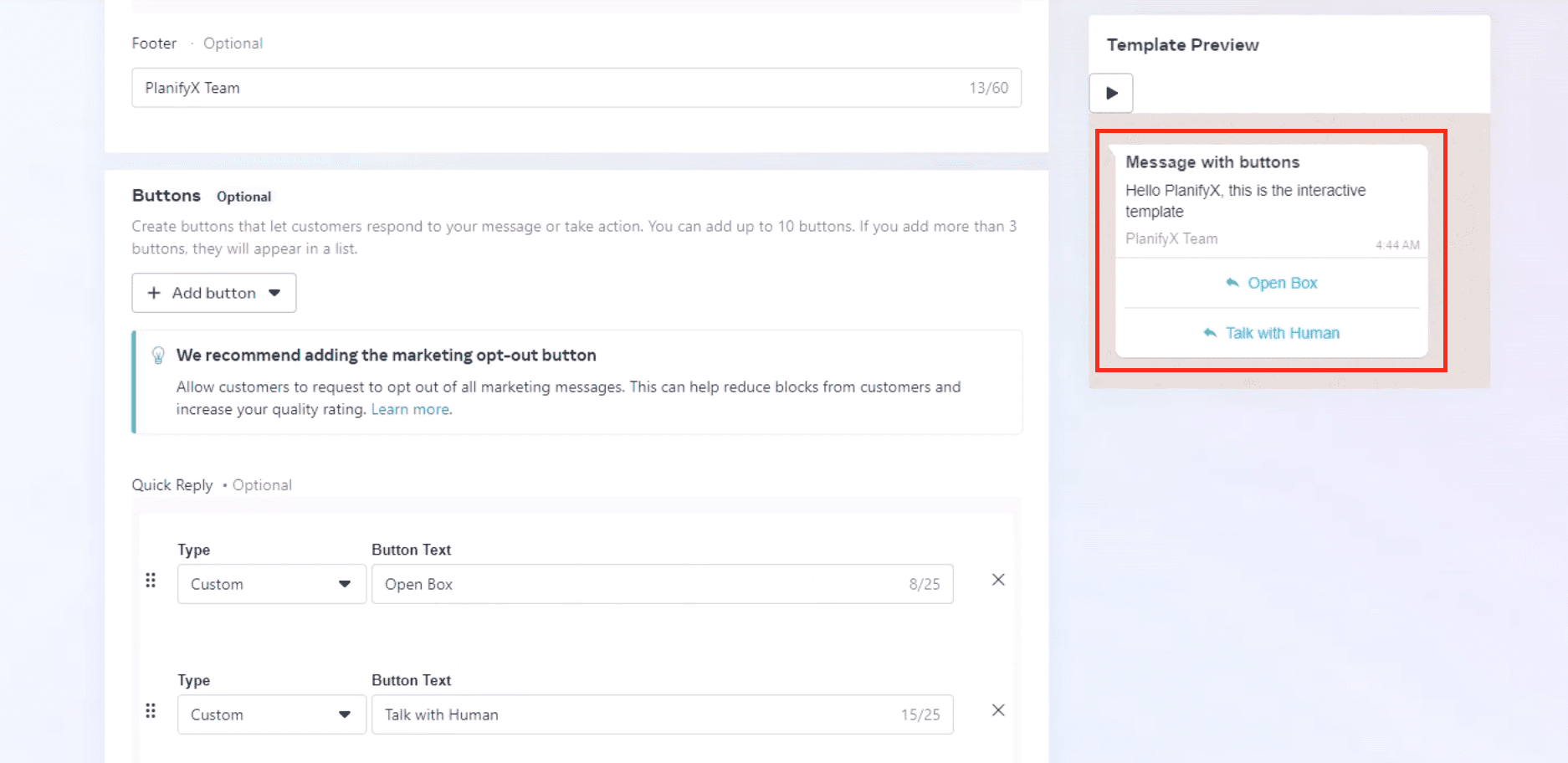 Adding interactive buttons to your WhatsApp templates enhances user engagement by providing clear and easy ways for recipients to interact with your messages. In this section, we’ll guide you through the process of creating templates with buttons, which can be used for quick replies that connect with your chatbots or to guide users to specific actions.