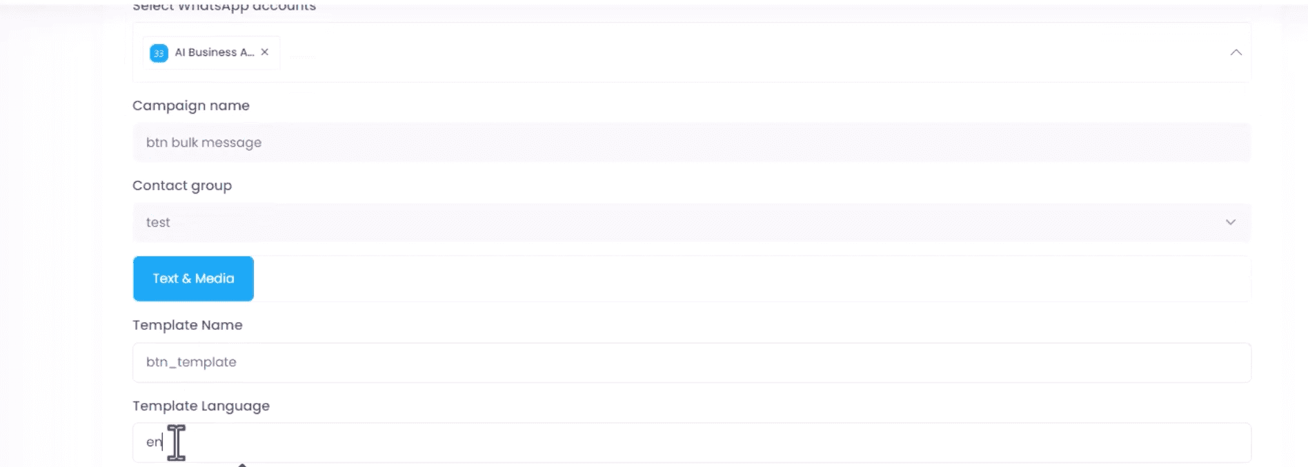 Set up a new bulk campaign. Back in our app, create a new bulk messaging campaign, select the account, choose a name for your campaign, and pick the contact list you want to use. Enter the template name, which in this case is btn_template, and set the language to English.