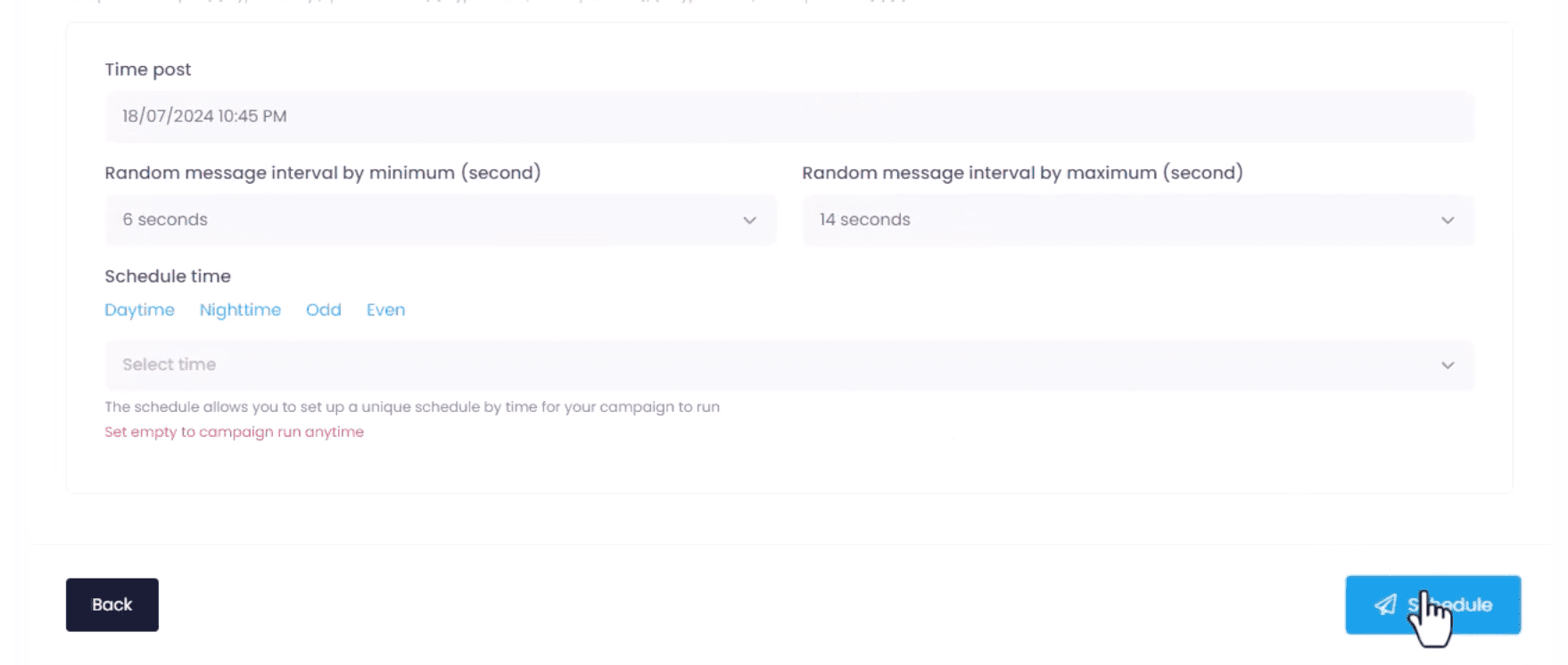 Schedule the message delivery. Set the timing parameters, such as the interval between sending messages, and then click “Schedule.”