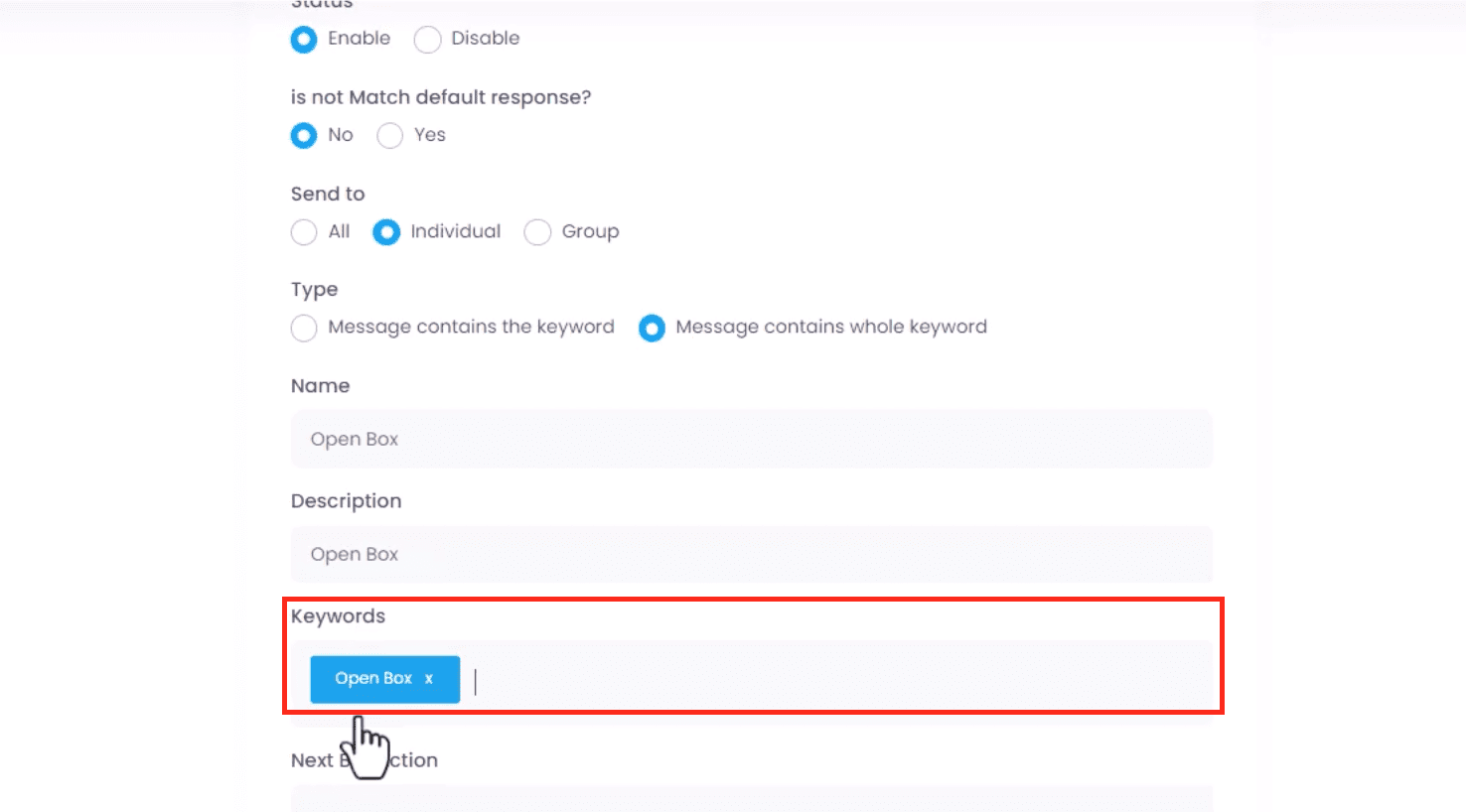 Enable the Chatbot and Set It Up. Configure the chatbot as an individual, meaning it will handle responses on a one-to-one basis. Set the rest of the settings as shown in the image. For the keyword match, paste the “Open Box” text, which corresponds exactly to the text used in the quick reply button. This keyword will trigger the chatbot’s response.