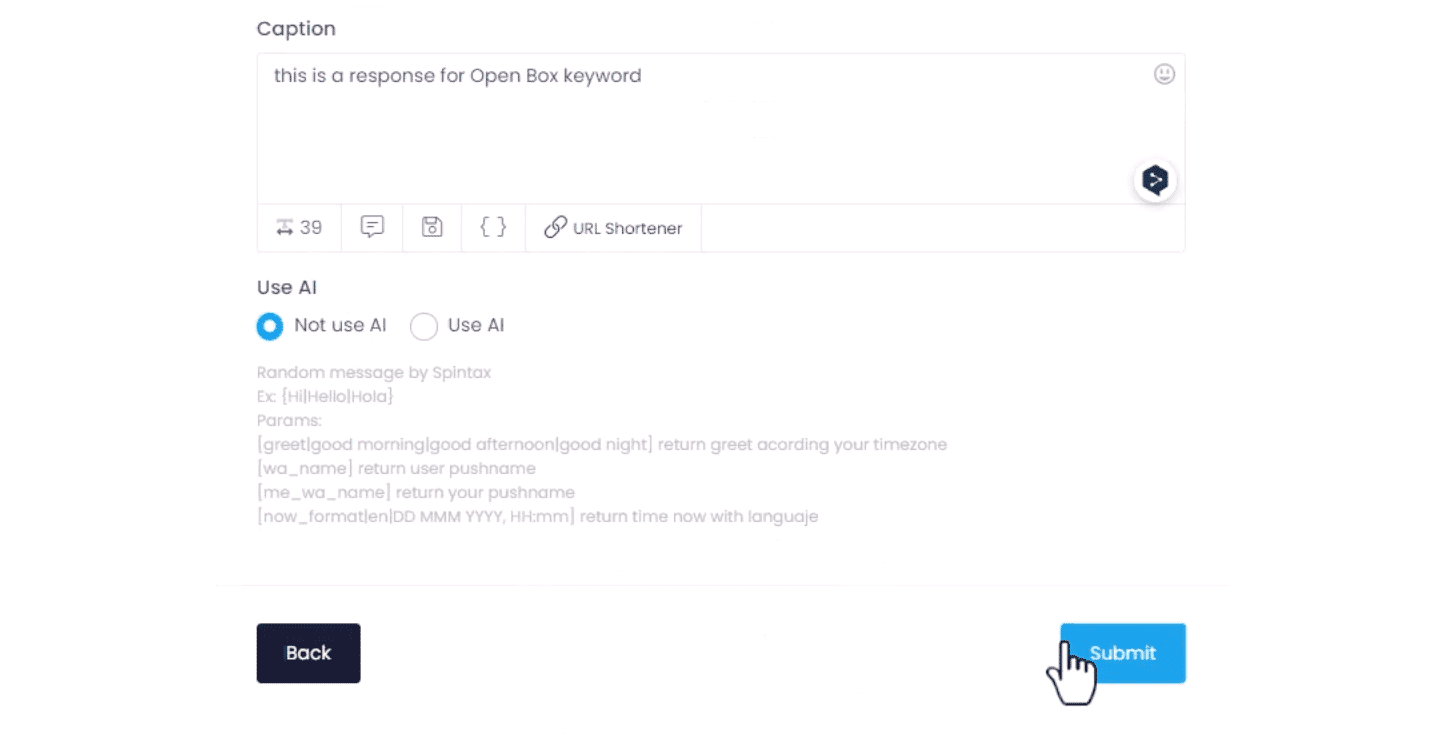 Define the Chatbot’s Response. Set a specific response message. For example, “this is a response for Open Box keyword.” Once the setup is complete, click submit to save the chatbot configuration.